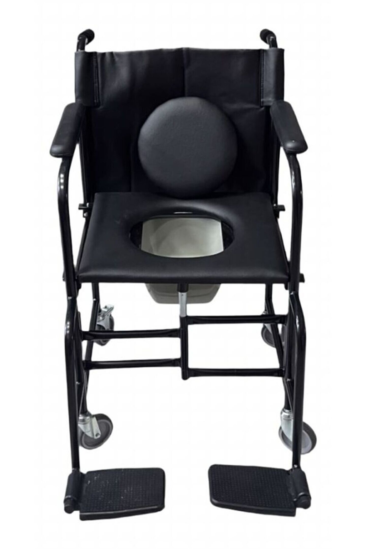 -Oturma yeri ve sırt kısmı sünger üzeri vinleks(Deri) kaplıdır. ; -Gövde katlanabilir. ; -Ayak koyma pedalları katlanabilir. ; -Oturma yeri altında lazımlık bulunur. ; -Lazımlık yeri kapalıdır ihtiyaç durumunda açabilirsiniz. ; -360 derece dönebilen dört adet tekerlek bulunmaktadır. ; -Arka tekerlekler fren tertibatlıdır. ; -Tüm metal aksamı elektrostatik toz boya ile kaplanmıştır. ; Oturma Yeri Yükseklik 45 cm Oturma yeri genişliği 50 cm oturma yeri derinliği 50 cm Ürünün uzunluğu 100 cm (asansöre sığma açısından bu ölçü önemlidir);