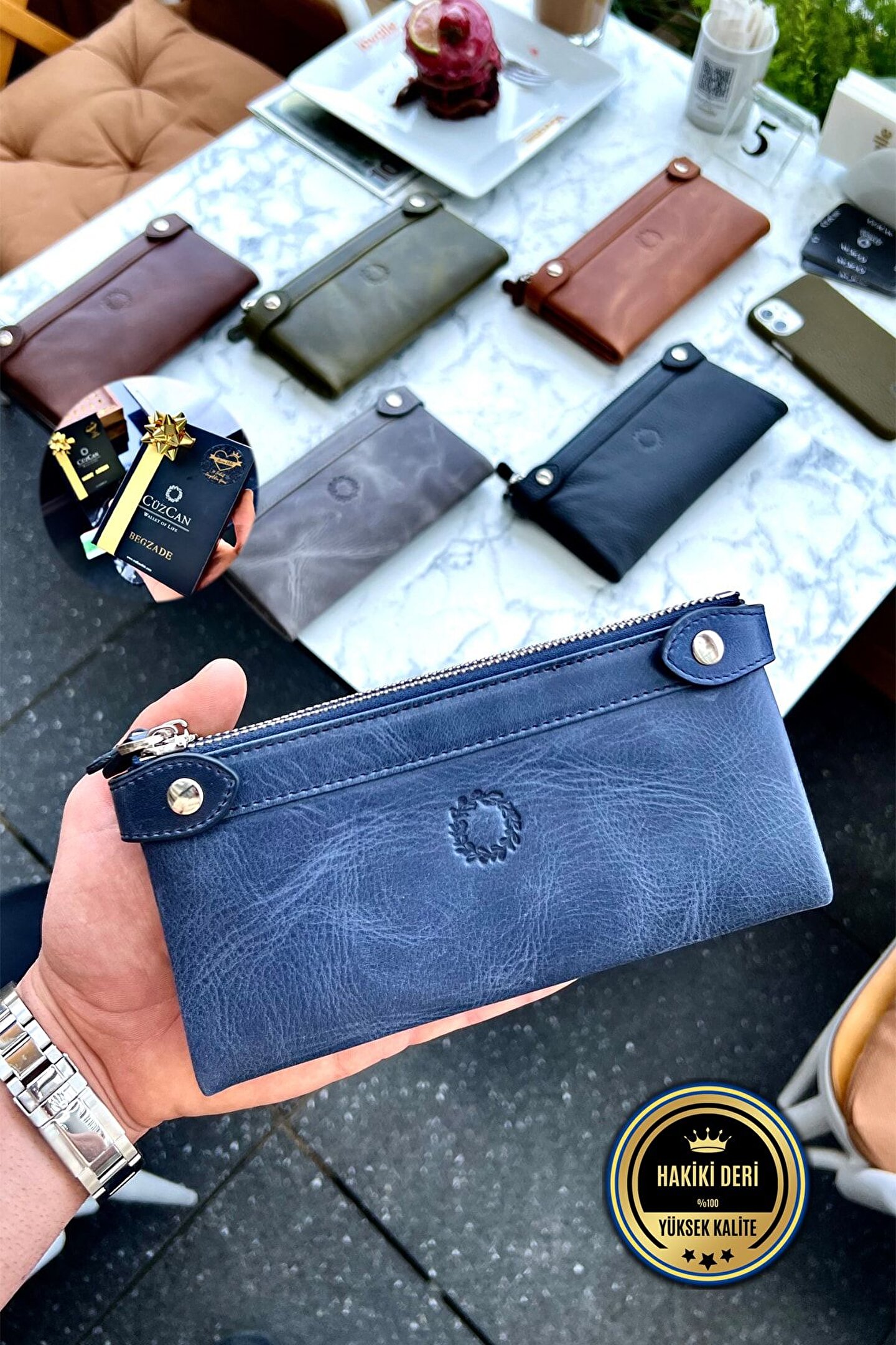 Antik Lacivert Çift Telefon Bölmeli Hakiki Deri Unisex Cüzdan Kişiye Özel Isim Baskılı