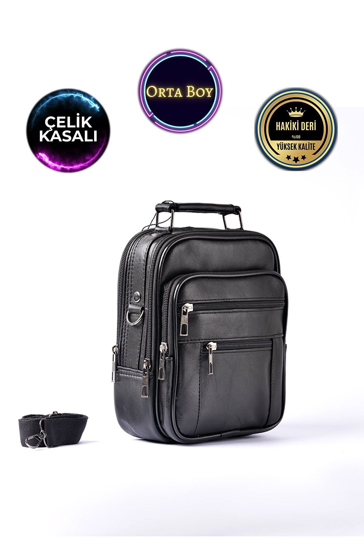 Erkek Siyah Çelik Kasalı Hakiki Deri El Ve Omuz Çantası Ayarlanabilir Askılı( Orta Boy)