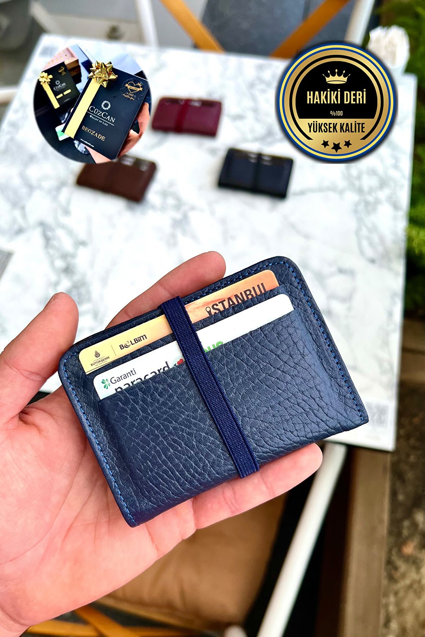 Lacivert Unisex Hakiki Deri Şeffaf Kart Bölmeli Lastikli Cüzdan (Kişiye Özel İsim Baskılı)