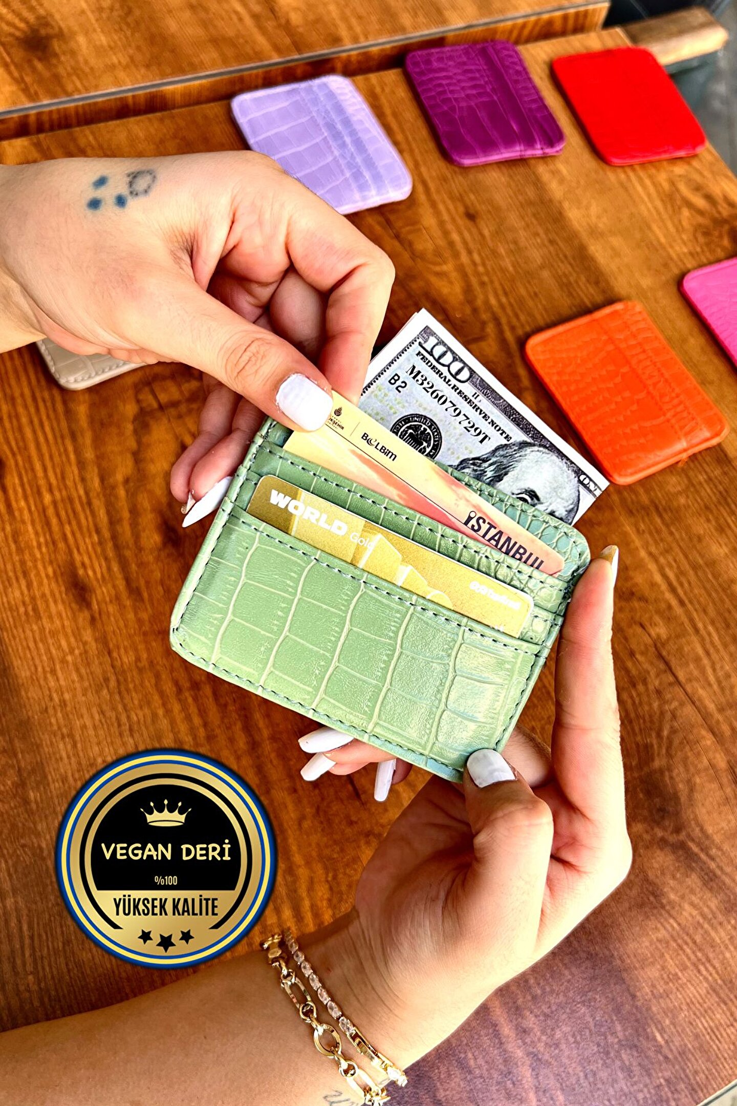 Mimi Su Yeşili Vegan Deri Süper Slimçift Taraflı Kartlık