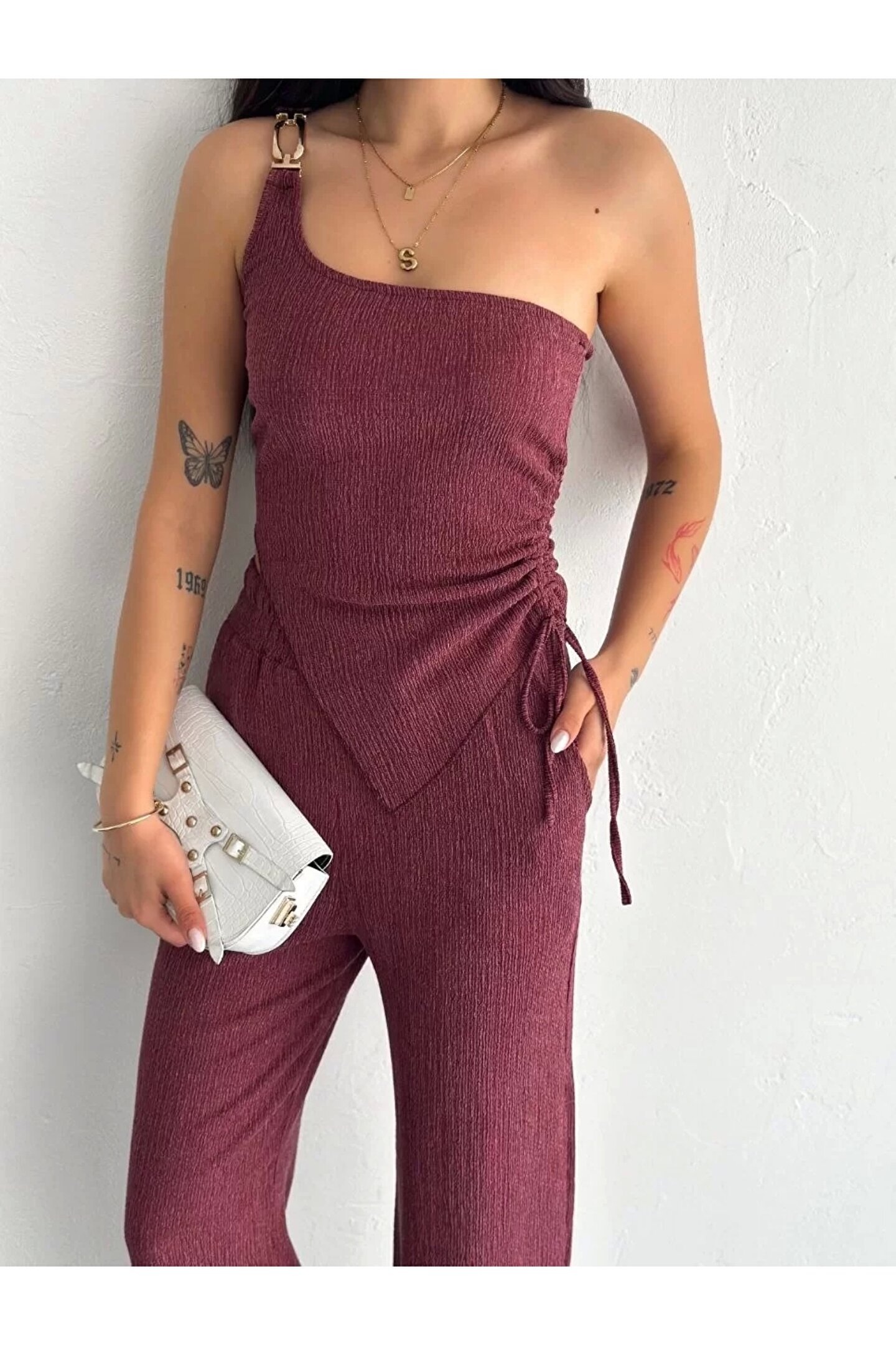 Asimetrik Crop Pantalon Ikili Takım - Gül Kurusu