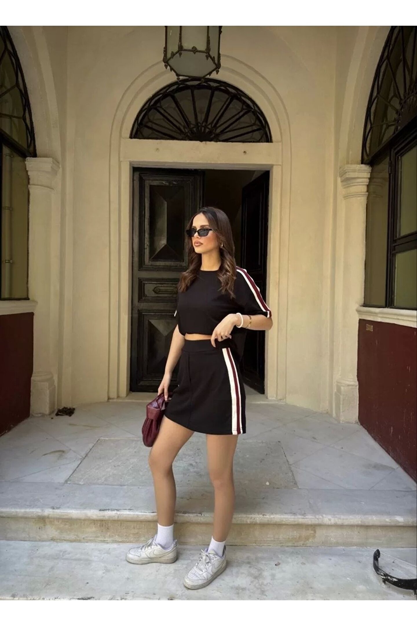 Osy Modal Yumuşak Dokulu Kumaş Parçalı Bisiklet Yaka T-shirt Mini Şortlu Etek İkili Takım - Siyah