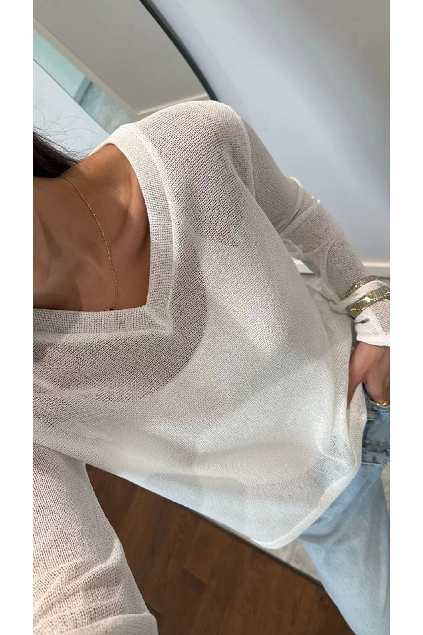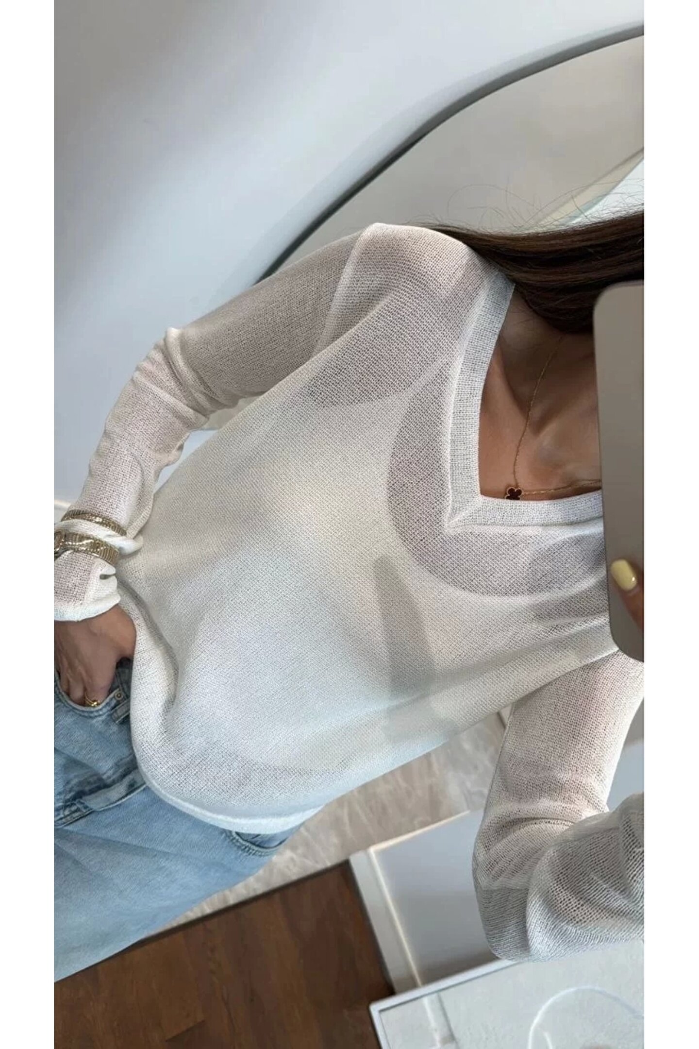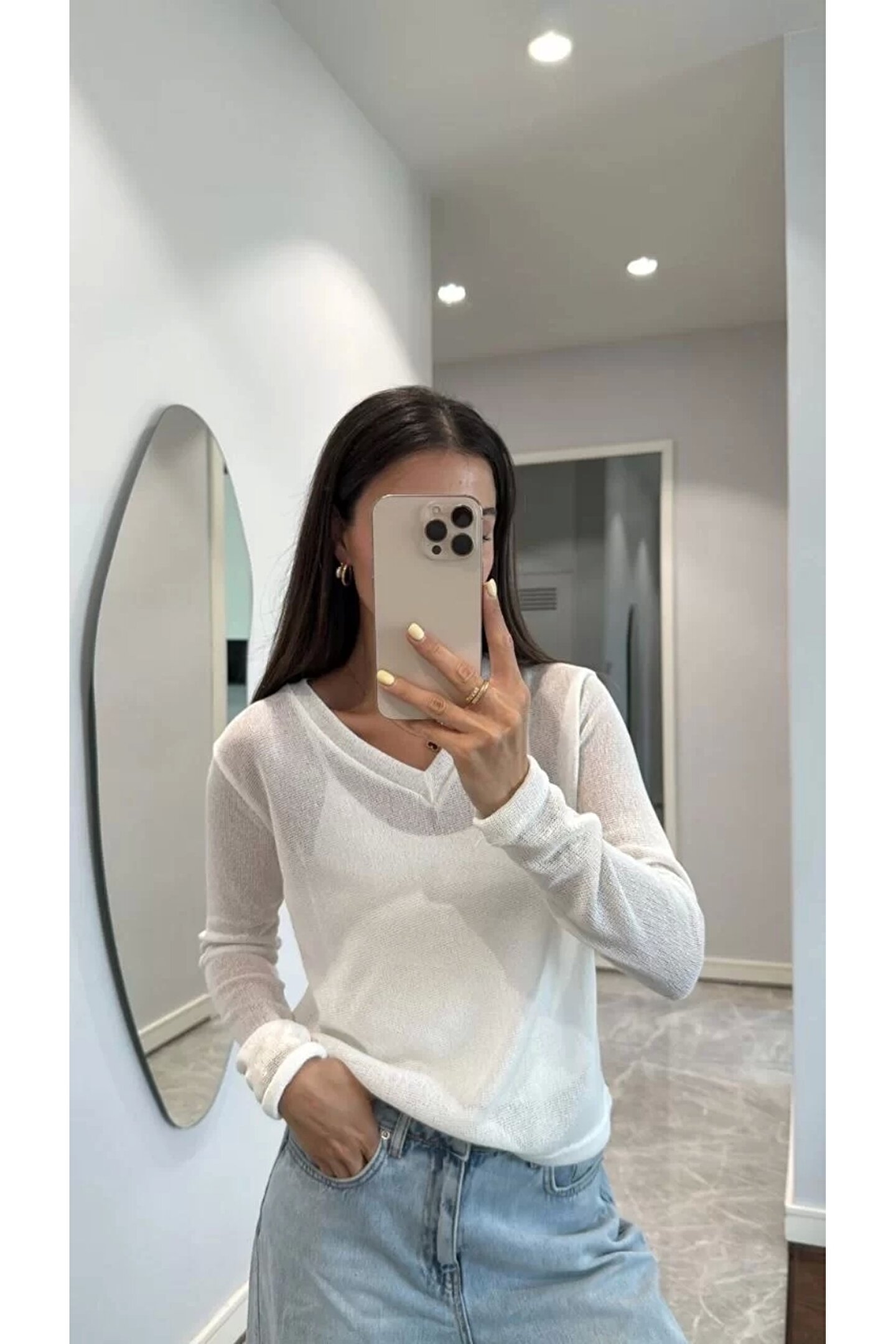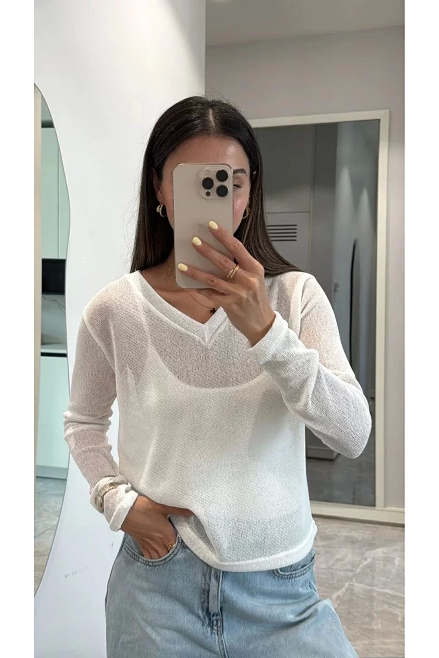 Cvs V Yaka uzun Kollu Triko ince Bluz - Beyaz