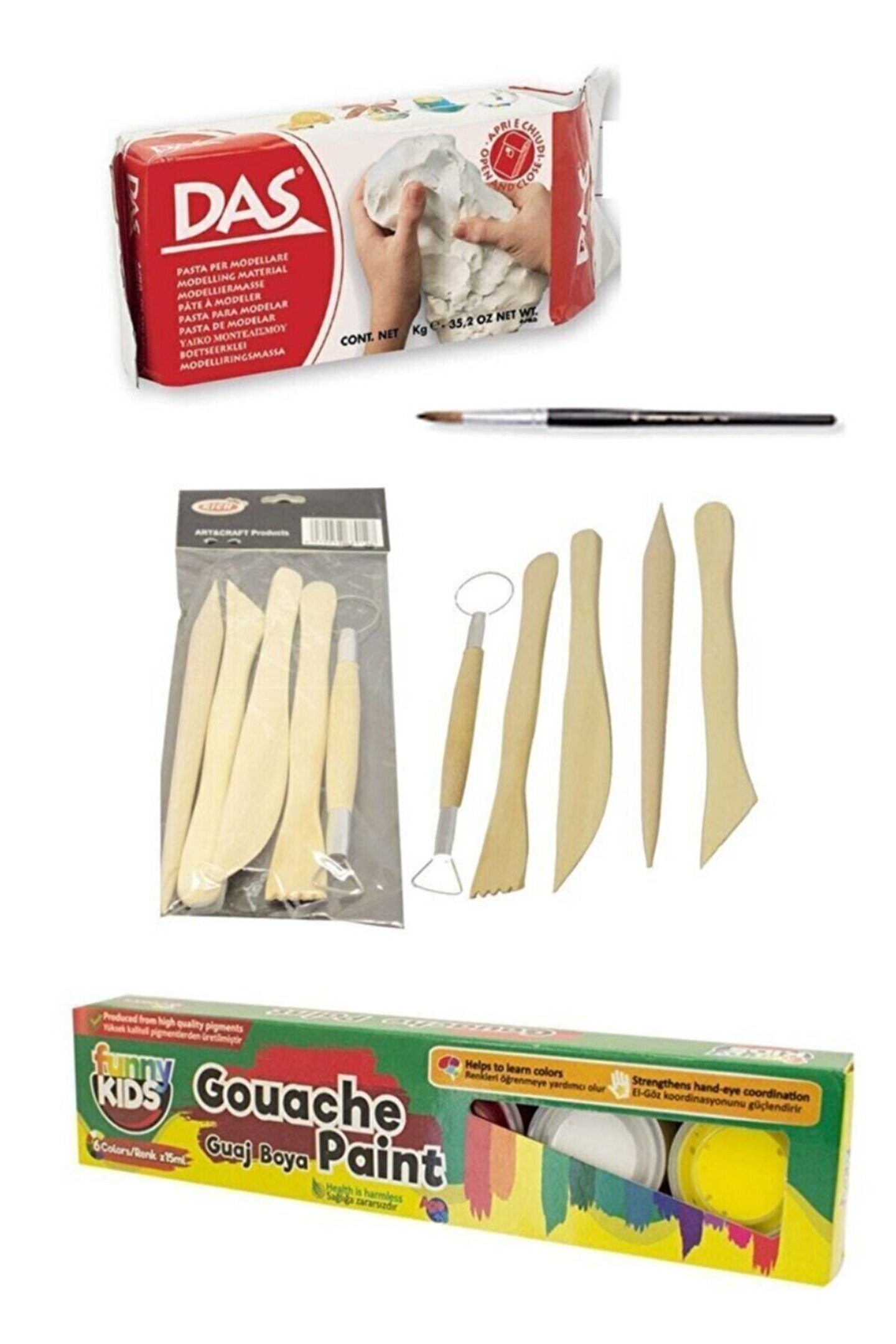Set içeriği: 1 adet Das beyaz 500 gr seramik kil, 1 adetrich yuvarlak fırça 4 numara, 1 adet Rich guaj boya 6 lı, 1 adet Rich modelaj başlangıç seti.;