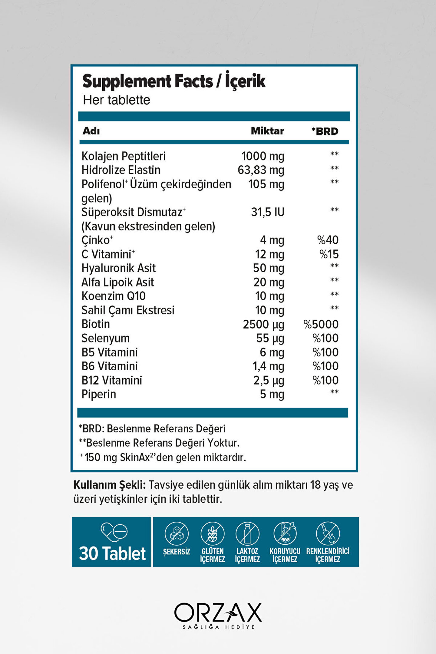 Day2day the collagen beauty elastin 1.000 mg kolajen peptit, elastin peptit, patentli özel formül skinax2 karışımı, r-Alfa lipoik asit, hyaluronik asit, piknogenol, koenzim q10, selenyum, çinko ve vitamin kompleks içeren tablet formda gıda takviyesidir.; Day2day the collagen beauty elastin balık kaynaklı tip ı kolajen ve elastin içerir.; Ürün içerisindeki kolajen peptit molekül ağırlığı 2kda=2000 dalton, elastin peptit molekül ağırlığı 1,4kda=1400 daltondur.; kolajen ve elastin kaynağı helal sertifikalıdır.; Day2day the collagen beauty elastin ürünü glüten içermez.; ürün içerisinde bulunan skinax2; kavun ekstresinden gelen süperoksit dismutaz, üzüm çekirdeğinden gelen polifenoller, mikroenkapsüle c vitamini, sitrat formda çinko bileşenlerinden oluşan patentli formüldür.; Skinax2 formülünün cilt elastikiyeti, cilt hassasiyeti ve cilt ışıltısı etkilerine dair yayınlanmış klinik çalışmayı görmek için tıklayınız.; balık kaynaklı tip 1 kolajen içerir.; her 1 tablette;adımiktarı*brdhidrolize kolajen peptitleri11000 mg**hidrolize elastin163,83 mg**skinax2150 mg**polifenol (üzüm çekirdeğinden gelen)105 mg**süperoksit dismutaz (kavun ekstresinden gelen)31,5 uı **çinko4 mg%40c vitamini12 mg%15hyaluronik asit 50 mg**alfa-Lipoik asit 20 mg**koenzim q1010 mg**piknogenol10 mg**selenyum55 µg%100biotin2500 µg%5000b5 vitamini6 mg%100b6 vitamini1,4 mg %100b12 vitamini2,5 µg%100piperin5 mg**kullanımı: tavsiye edilen kullanım miktarı yetişkinler için günde tok karna 1 tablettir.