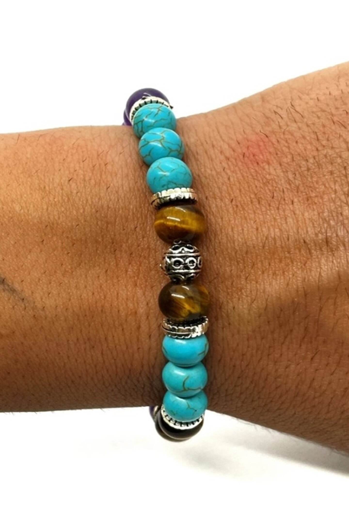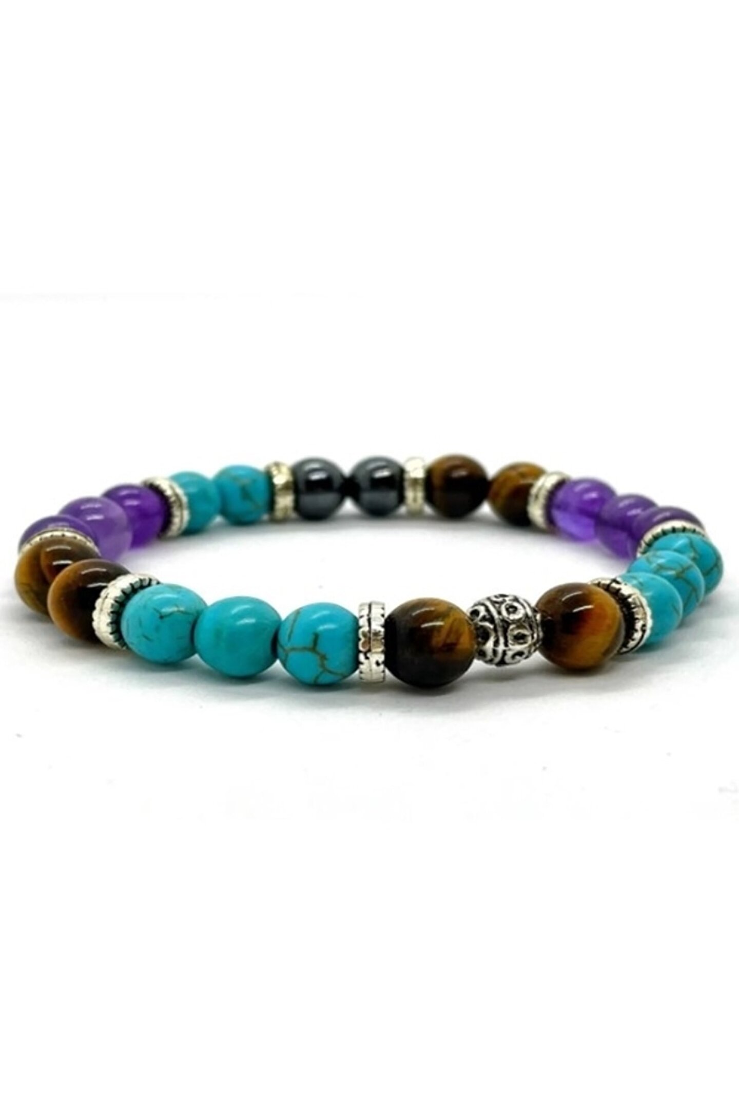 Gerçek doğal taş kullanılarak üretilmiş, şıklığı ve doğallığı bir arada sunan bileklik; Turkuaz, kaplan gözü, ametist ve hematit gibi farklı renklerdeki taşlarla zenginleştirilmiş tasarım, her zevke hitap eder; Doğal taş materyali sayesinde her bileklik benzersiz ve özgün bir görünüm kazanır; Doğal taşların eşsiz dokusu ve renkleriyle dikkat çeken bu bileklik, günlük kullanım için idealdir;