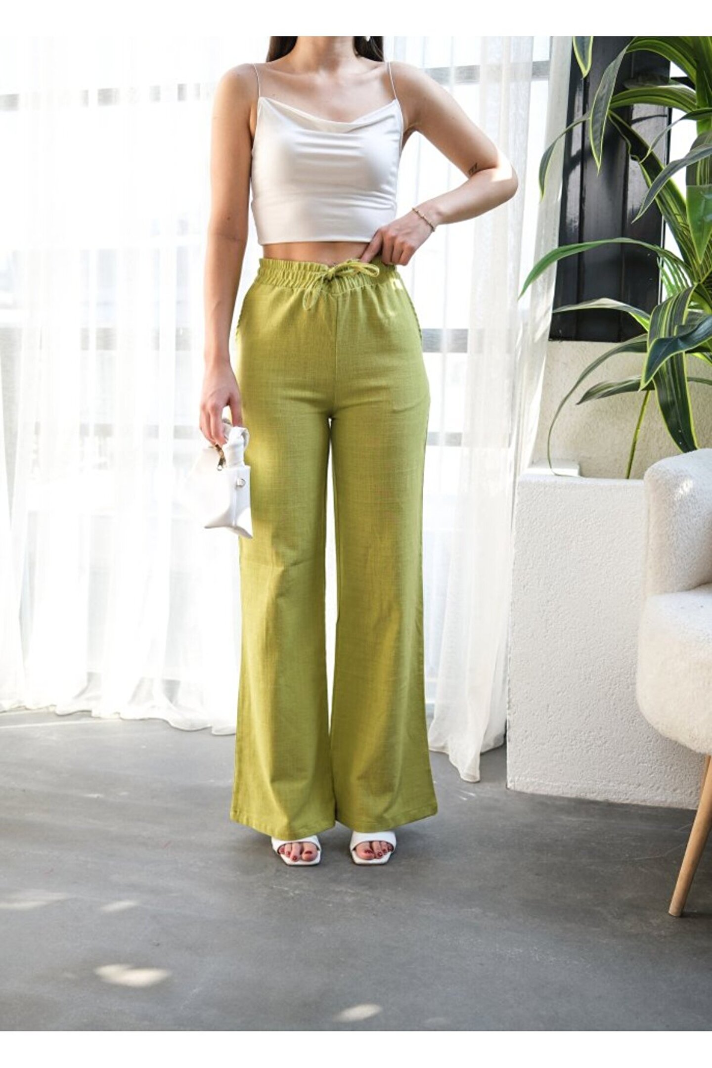 Beli Lastikli Ve Bağcikli Keten Pantolon