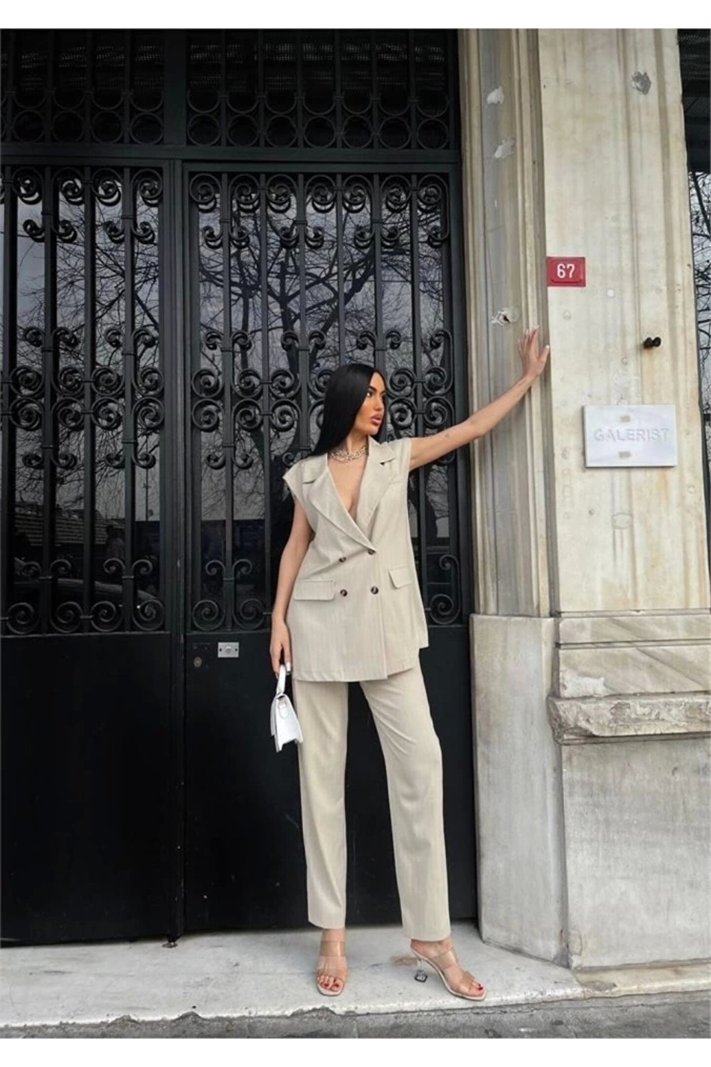ÇİZGİLİ UZUN YELEK - PANTOLON TAKIM POLVİSCON - Bej
