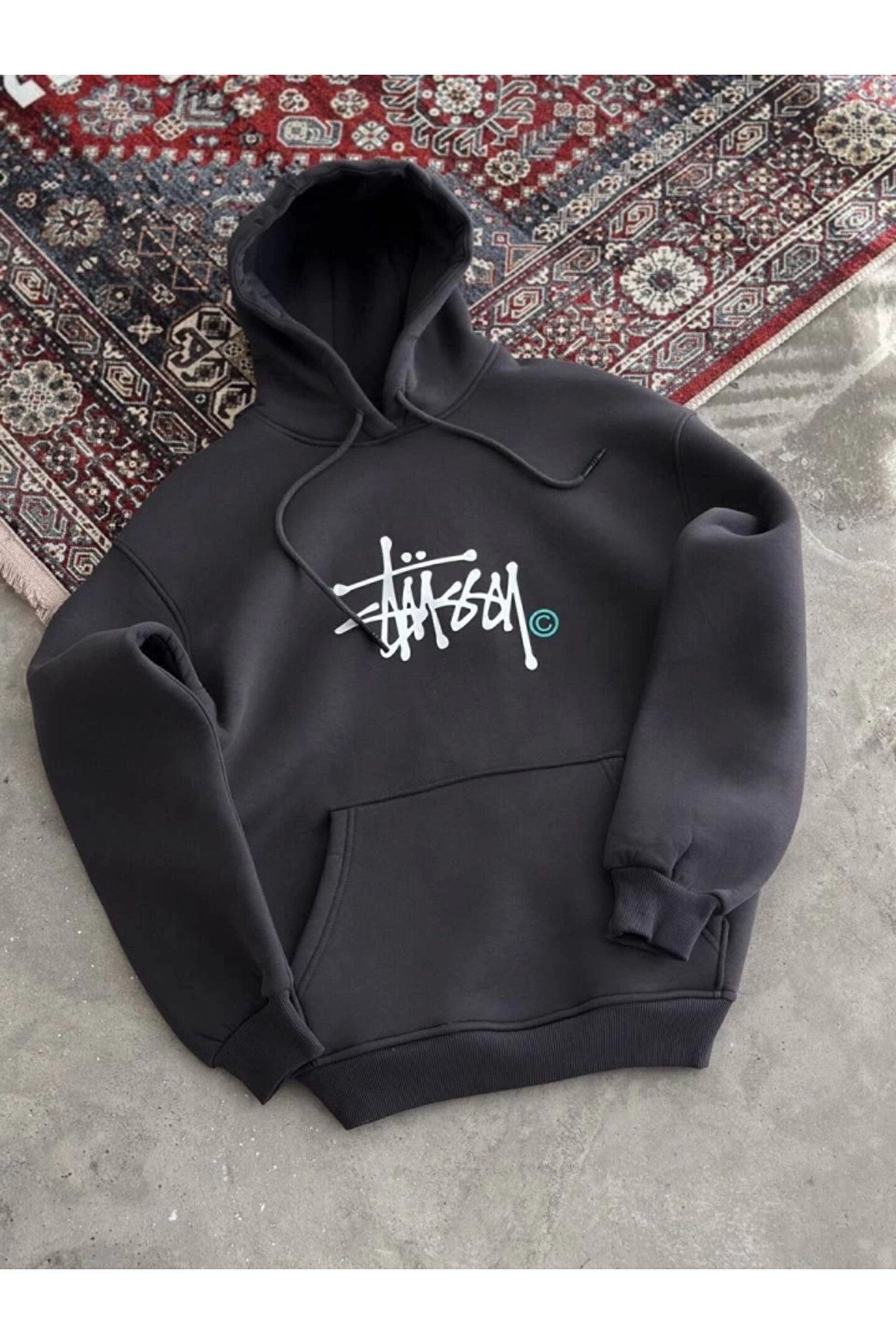 Üç İplik Kapşonlu Baskılı SweatShirt - Füme