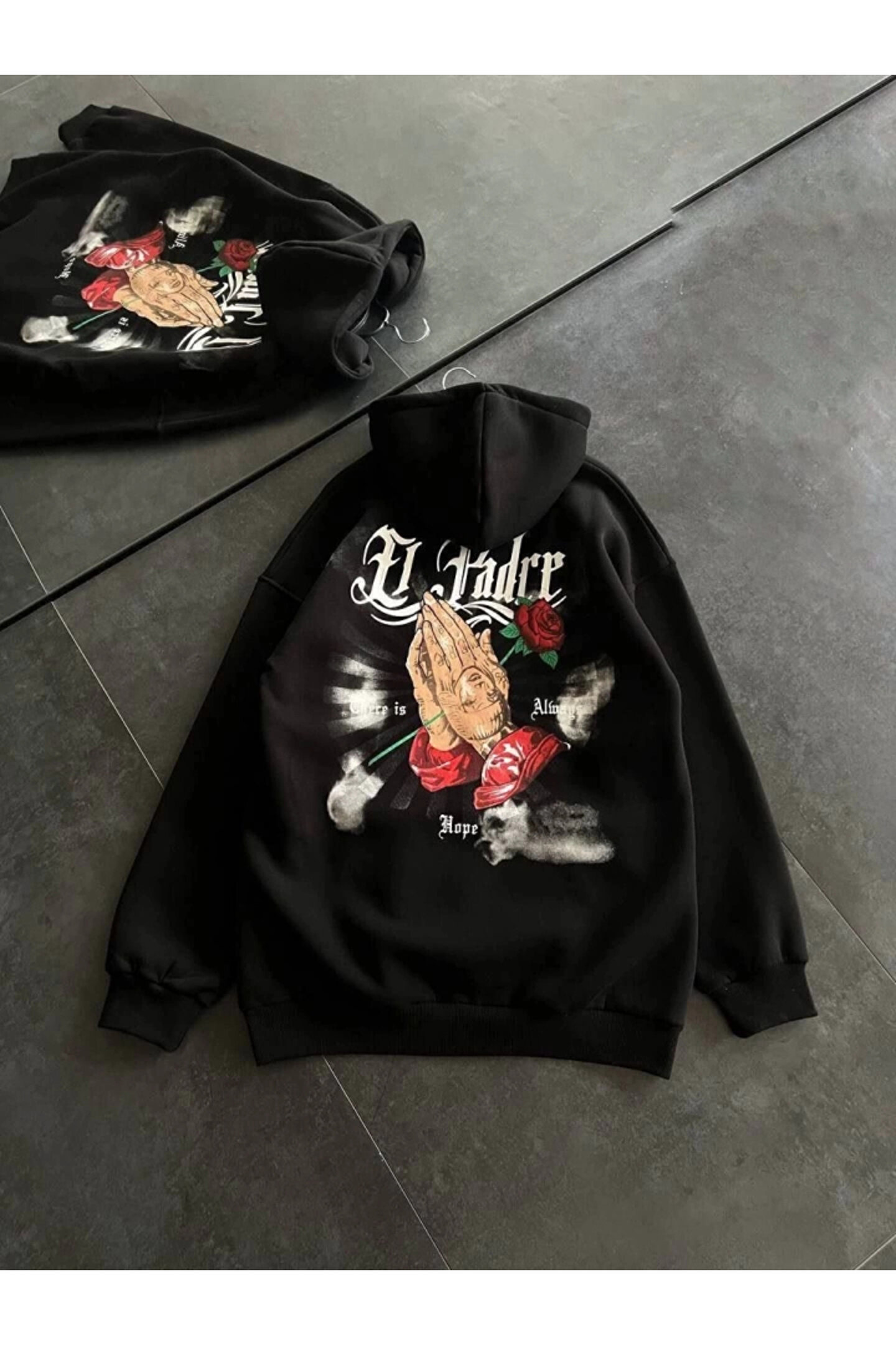 Üç İplik Penye Uzun Kol Kapşonlu Baskılı SweatShirt - Siyah