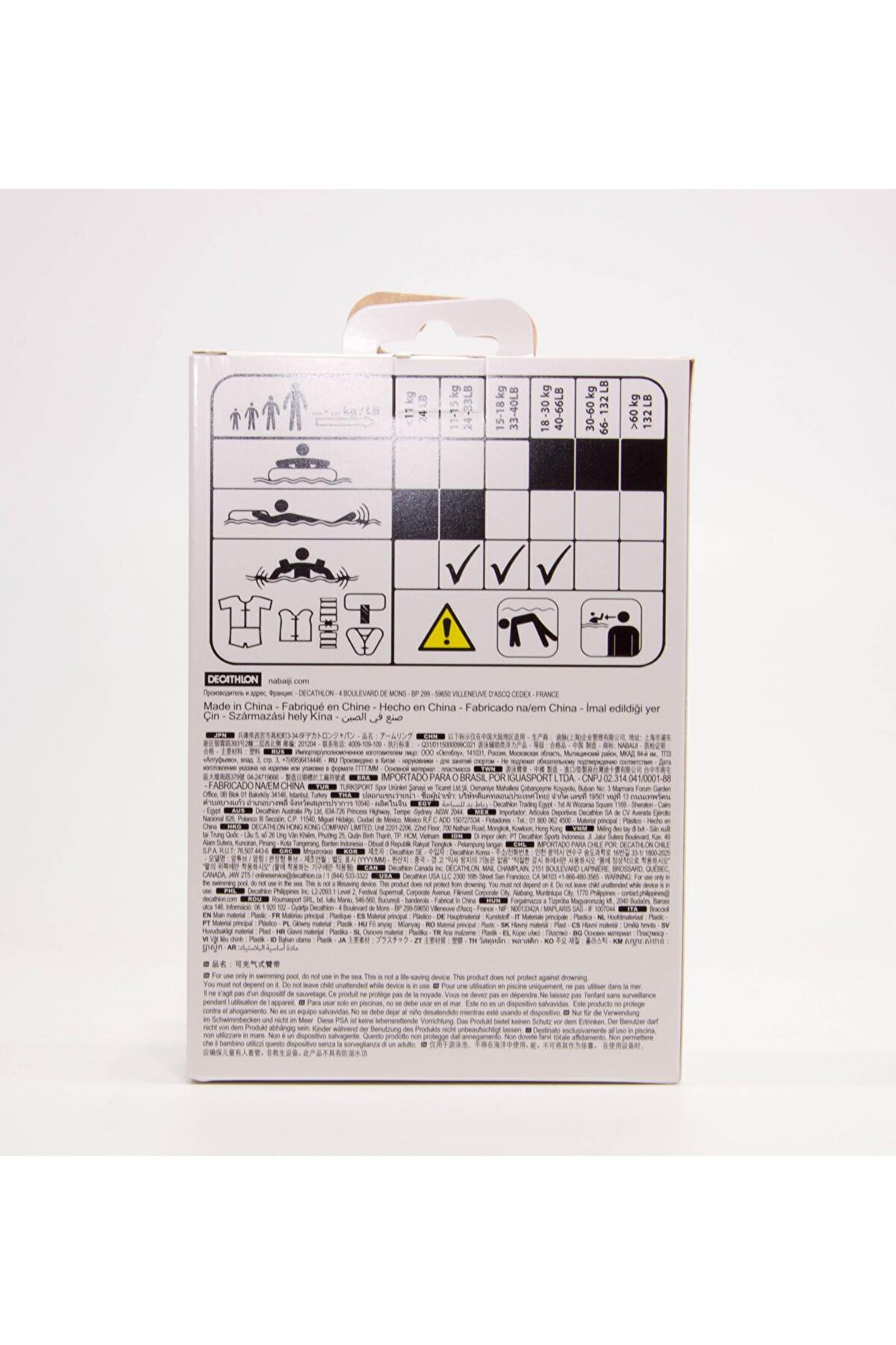 8545667 11 - 30 kg ağırlığında, suyu keşfeden ve kulaç atmaya başlayan çocuklar için tasarlandı. ; Güçlendirilmiş tek yönlü tıpaları ile şişirilen iki bölmeye sahip havuz kolluğu. ; Çocukların yetişkin gözetiminde su sporlarını keşfetmesi için idealdir. ; Yüzdürmeye yardımcı EN 13138-1 25 newton standardına uygundur, 30 newton yüzerlik seviyesi. ; Yer kaplamama Havası indirildiğinde kolayca çantanıza sığar. ; Denge Her kolluk ayrı olarak şişirilebilen aynı boyda 2 bölmeye sahiptir. ; Giyme / çıkarma kolaylığı 1 parçasının şişirin, çocuğun koluna takın ve diğer parçayı şişirin.Bebek/çocuk su sporları, çocukların psikomotor gelişimlerine katkı sağlar. ; Nabaiji bebek/çocuk su sporlarında 3 farklı deneyim sunar: Suyu keşfetme, yüzmeyi keşfetme ve dalmayı keşfetme Her deneyime uygun farklı ürünler mevcuttur. ; Bu kolluklar "Suyu keşfetme" aşaması için idealdir: Kollardaki yüzerlik seviyesinin yüksek olması çocuğun başını suyun üstünde tutabilmesini ve suyu keşfederken kendine olan güveninin yavaş yavaş artmasını sağlar. ; Suyun içinde bacaklarının da yardımıyla çoğunlukla dikey bir pozisyonda hareket ederler. ; Ürün ağırlığı Yaklaşık 130 g. ; Valf nasıl çalışır? Kolluklarımız hava kaçırmayan kapağı bulunan PVC valf ile donatılmıştır. ; Ürünü doğru bir şekilde şişirmek için kapağı açmak adına valfin altına bastırmanız gerekir. ; Valfi yaklaşık 2 saniyede mekanik olarak kapanır, şişirme sonrasında biraz hava sızması normaldir. ; Bu nedenle hızlıca kapatmak gerekir. ; Şişirdiğim halde ürün hava kaçırıyorsa ne yapmalıyım? Valf doğru çalışmıyor olabilir. ; Eğer düzgün kapanmamışsa ağız kapanmadan önce dışarı yüksek miktarda hava sızabilir. ; Düzgün yerleştirmek için parmaklarınızla 2 - 3 defa sıkın ardından ürünü maksimum seviyede şişirin ve kapağı kapatın. ; Valfin düzgün oturması gerekir. ; Renginin atmaması için kullanım önerisi Kullandıktan sonra kolluklarınızı yıkayın ve güneş altında bırakmayınÜrün Bileşimi Ana kumaş 100% Polivinil Klorür SAKLAMA TAVSİYESİ Duru su ile yıkayın, açık havada kurutun, kuru ve havadar bir yerde güneş ışınlarından uzakta muhafaza edin. ; Kullanıcı Talimatları Yetişkin gözetiminde kullanılmalıdır. ; TESTLER Yüzme öğrenenler için yüzmeye yardımcı EN13138-1 yüzerlik standardına uygundur. ; NABAIJI kolluklar standardın üzerinde bir yüzerlik seviyesine sahip olmalıdır (25 newton olan bir standart için 30 newton) Onaylayan Bağımsız laboratuvarlar tarafından test edilip onaylanmıştır. ; Bakım tavsiyesi Yıkamayınız Yıkamayınız Beyazlatıcı kullanmayınız Beyazlatıcı kullanmayınız Tamburlu kurutma yapmayınız Tamburlu kurutma yapmayınız Ütülemeyiniz Ütülemeyiniz Kuru temizleme yapmayınız Kuru temizleme yapmayınız;