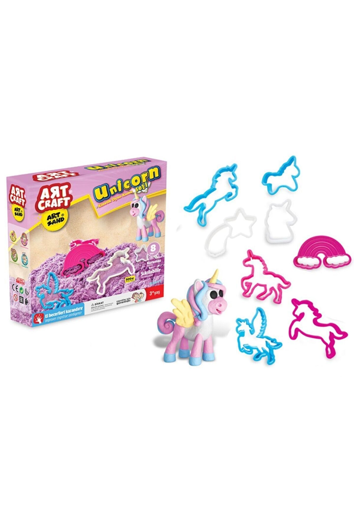 Dede Art Craft Unicorn Kinetik Kum Seti 500GR Art Craft Unicorn Kinetik Kum Seti 500gr Kinetik Kum deniz kumu ile oynamanın muhteşemliğini evinize kadar getirecek, hem de dağılmadan kirletmeden! Çocukların el göz koordinasyonunu geliştirir.; El becerilerini arttırır.; Problem çözme yeteneği kazandırır.; Set 8 parçadan oluşmaktadır.; Yaş Grubu : 3+ Yaş Barkodu: 8693830036114 Item No : 03611 Kutu Ölçüleri : 22,5 x 22,5 x 6,5 cm.; Desi Değeri: 1