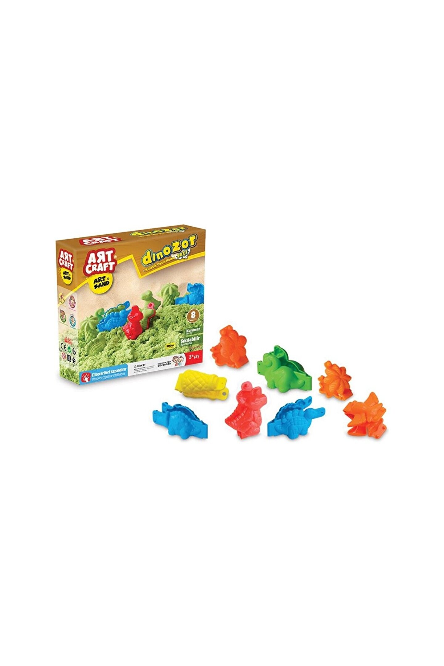 Ürün; 8 parçadan ve 500gr oyun kumundan oluşmaktadır.; Oyun kumu, sıkılabilir ve kurumaz.; El ve motor becerileri kazandırır.; Hayal gücünü ve duyuları geliştirmeye yardımcı olur.; Yerli üretimdir.; Ürün; 3 yaş altı çocuklar için uygun değildir.; 3 yaş altı çocuklar büyüklerinin kontrolünde oynamalıdır.; Sağlık testlerinden geçmiştir.; Yerli üretimdir.