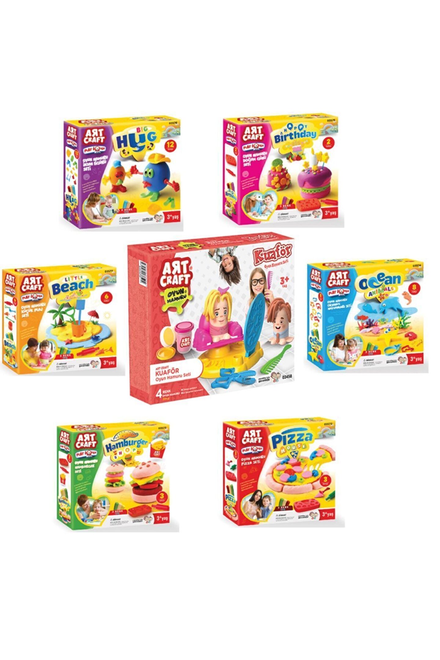 Kuaför + Okyanus + Plaj + Figür + Pizza + Doğum Günü + Hamburger Oyun Hamuru Setleri1-Kuaför Oyun Hamur Seti 224 Gr Toksit madde içermeyen, temiz modelleme hamurundan oluşan kuaför oyun hamur seti.; test raporlu, sertifikalı ve laboratuvar onaylıdır.; Zekayı geliştirir.; El becerileri kazandırır.; Ürün.; 4 adet 56gr oyun hamuru ve birçok aksesuardan oluşmaktadır.; Ürün.; 3 yaş altı çocuklar için uygun değildir.; Sağlık testlerinden geçmiştir.; Yerli üretimdir; 2-Okyanus Hayvanları Seti Oyun Hamuru 150 gr Okyanusta hayat var! Sevimli okyanus hayvanlarını kendin şekillendirerek öğrenmeye ne dersin? Ürün.; 8 adet kalıptan ve 3 renk hamurdan oluşmaktadır.; El becerileri kazandırır.; Hayal gücünü zenginleştirir.; Duyuları geliştirir.; Öğrenmeyi pekiştirir.; Ürün.; 3 yaş altı çocuklar için uygun değildir.; Sağlık testlerinden geçmiştir.; Yerli üretimdir; 3-Plaj Seti Oyun Hamuru 150 gr Küçük plaj seti ile birlikte hayalindeki plajı yarat! Ürün.; 6 parçadan ve 3 renk hamurdan oluşmaktadır.; El becerileri kazandırır.; Hayal gücünü zenginleştirir.; Duyuları geliştirir.; Öğrenmeyi pekiştirir.; Ürün.; 3 yaş altı çocuklar için uygun değildir.; Sağlık testlerinden geçmiştir.; Yerli üretimdir; 4-İnsan Figürü Seti Oyun Hamuru 150 gr Ürün.; 12 parçadan ve 3 renk hamurdan oluşmaktadır.; El becerileri kazandırır.; Hayal gücünü zenginleştirir.; Duyuları geliştirir.; Öğrenmeyi pekiştirir.; Ürün.; 3 yaş altı çocuklar için uygun değildir.; Sağlık testlerinden geçmiştir.; Yerli üretimdir; 5-Pizza Seti Oyun Hamuru 150 gr Yapacağın pizzayı çok merak ediyoruz! Ürün.; 3 parçadan ve 3 renk hamurdan oluşmaktadır.; El becerileri kazandırır.; Hayal gücünü zenginleştirir.; Duyuları geliştirir.; Öğrenmeyi pekiştirir.; Ürün.; 3 yaş altı çocuklar için uygun değildir.; Sağlık testlerinden geçmiştir.; Yerli üretimdir; 6-Doğum Günü Oyun Hamuru 150 gr Doğum gününde hayalindeki pasta seninle! Minik ellerinle, kendi pastanı yapmanın tadını çıkar! Ürün.; 2 parçadan ve 3 renk hamurdan oluşmaktadır.; El becerileri kazandırır.; Hayal gücünü zenginleştirir.; Duyuları geliştirir.; Öğrenmeyi pekiştirir.; Ürün.; 3 yaş altı çocuklar için uygun değildir.; Sağlık testlerinden geçmiştir.; Yerli üretimdir; 7-Hamburger Set Oyun Hamuru 150 gr Minikler, minik hamburgerler yapıyor! Ürün.; 3 parçadan ve 3 renk hamurdan oluşmaktadır.; El becerileri kazandırır.; Hayal gücünü zenginleştirir.; Duyuları geliştirir.; Öğrenmeyi pekiştirir.; Ürün.; 3 yaş altı çocuklar için uygun değildir.; Sağlık testlerinden geçmiştir.; Yerli üretimdir