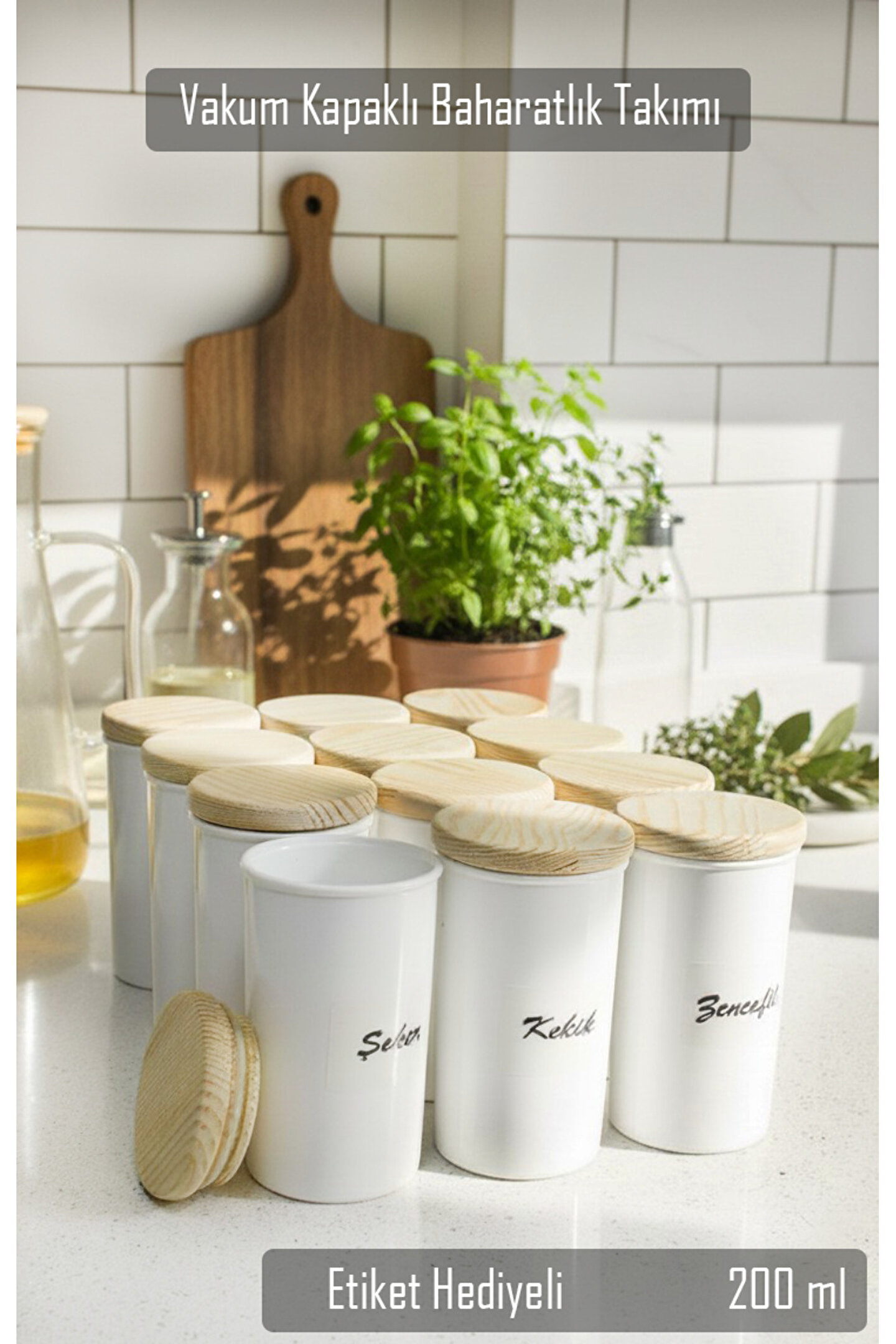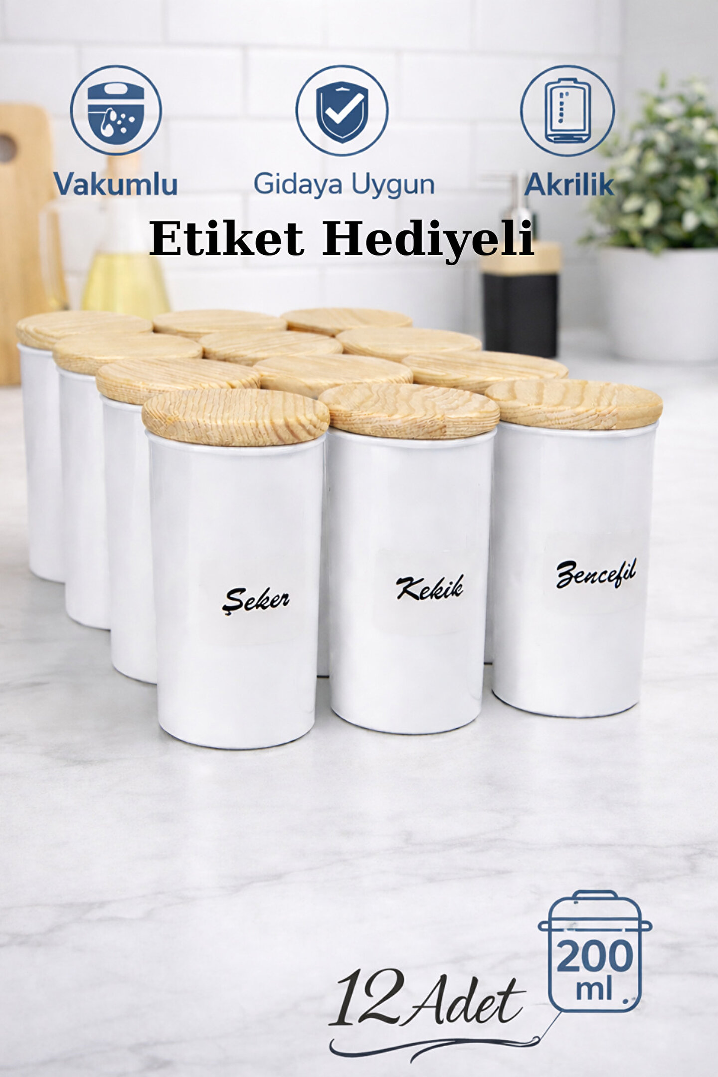 - 12 adet 200 ml kapasiteli, porselen görünümlü akrilik baharatlıklar ile mutfak düzeninizi kolayca yönetin.; - Her bir baharatlığın vakumlu ahşap kapakları sayesinde tazeliklerini uzun süre koruyarak lezzetli yemekler hazırlamanızı sağlar.; - Ürünün gıda temas sembolü bulunması, sağlık standartlarına uygun malzemelerden yapıldığını gösterir; güvenle kullanabilirsiniz.; - Türkiye'de üretilen bu baharatlıklar, yerel kaynaklı malzemelerle kaliteyi evinize getiriyor.; - Set içerisindeki etiket hediyeleriyle baharatlarınızın isimlerini kolayca tanımlayabilir ve ihtiyacınız olanı hızlıca bulabilirsiniz.