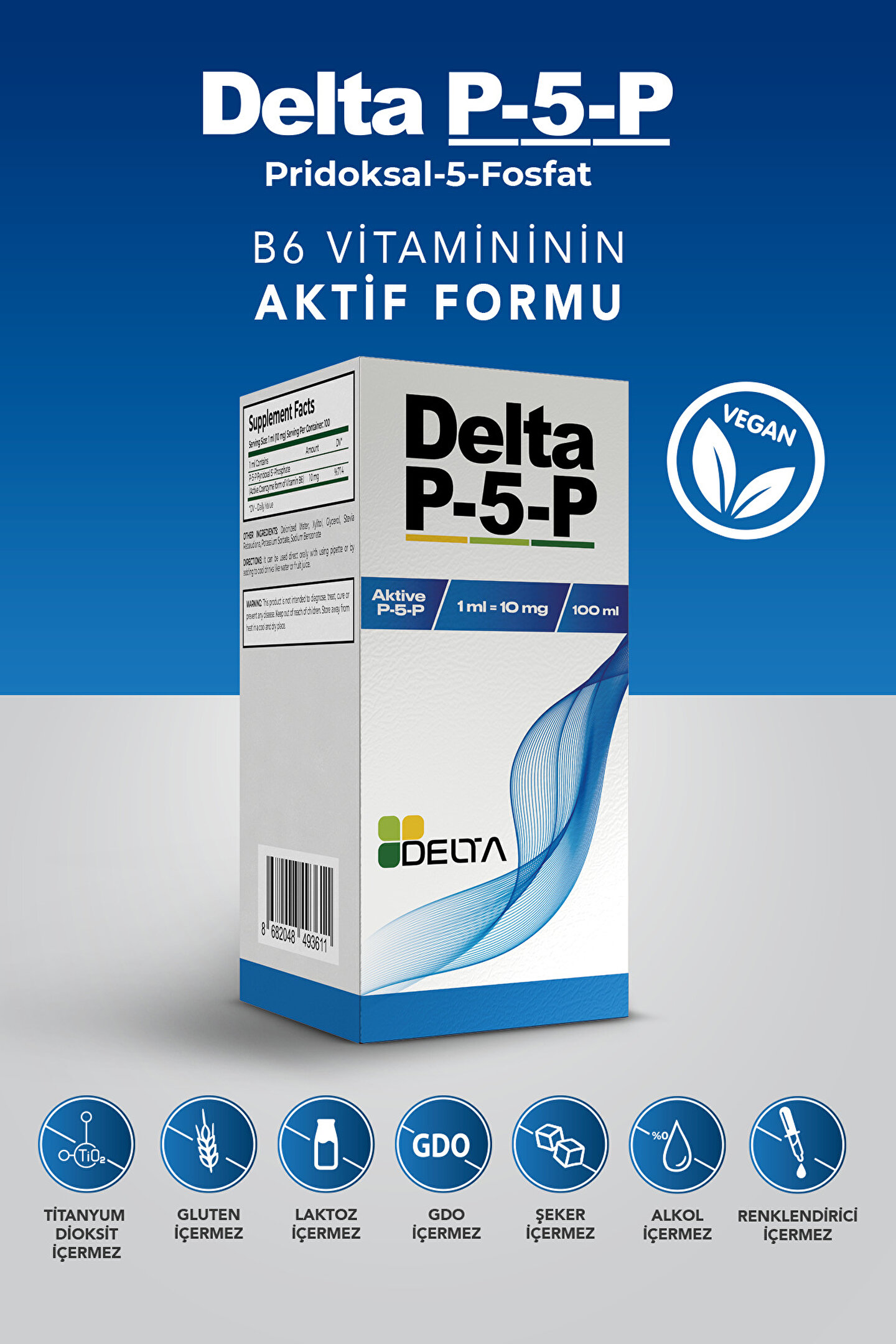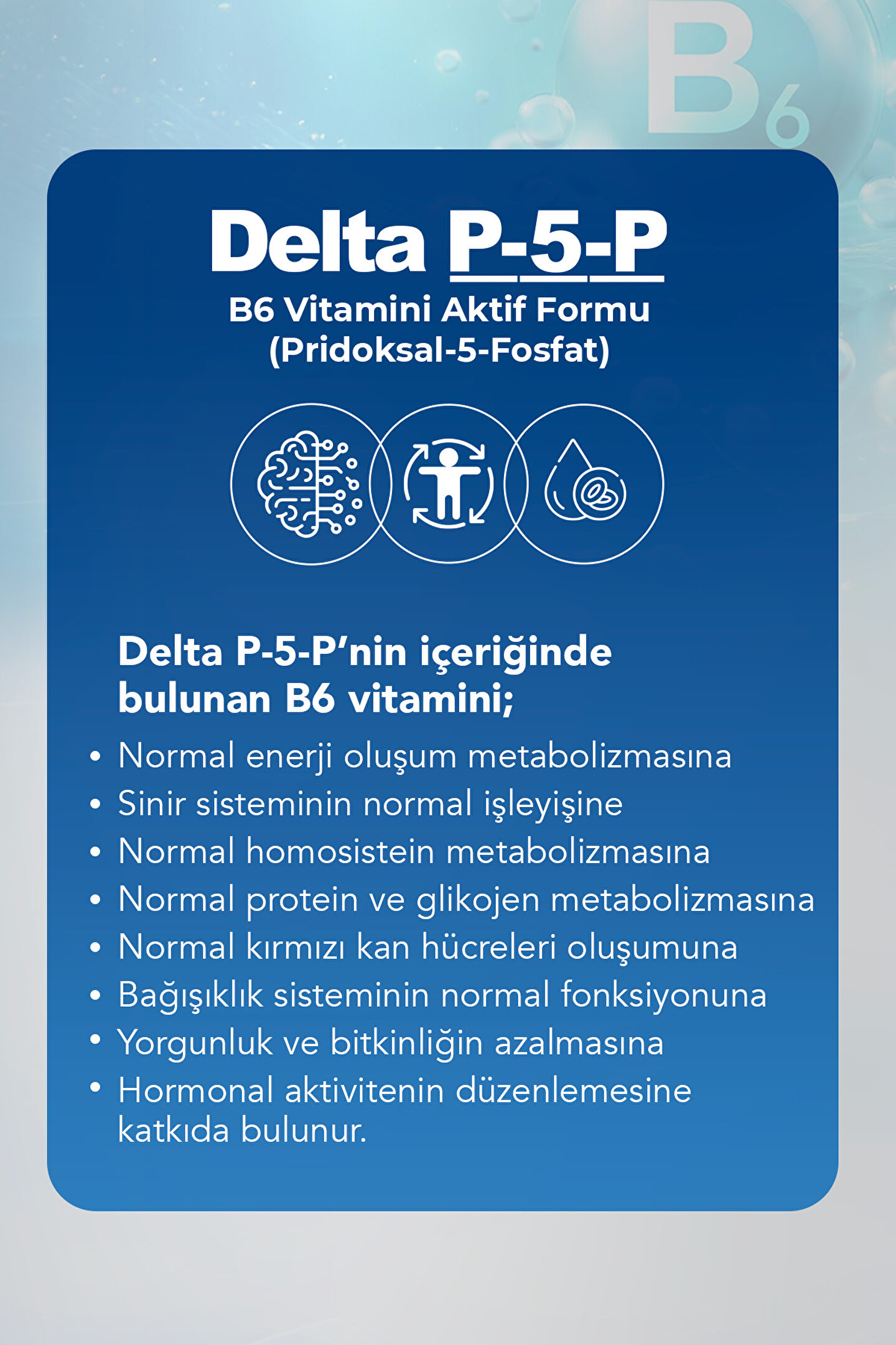 Sıvı formda, kolay tüketim için pratik bir kullanım sunar; B vitamini kompleksi içeriği ile günlük vitamin ihtiyacınızı karşılar ve enerji seviyenizi destekler; Pridoksal 5; fosfat formülü, vücutta önemli biyolojik süreçlerin düzenlenmesine yardımcı olur; 100 ml'lik ambalajı sayesinde dozaj kolaylığı sağlar ve günlük vitamin alımınızı düzenli tutar;