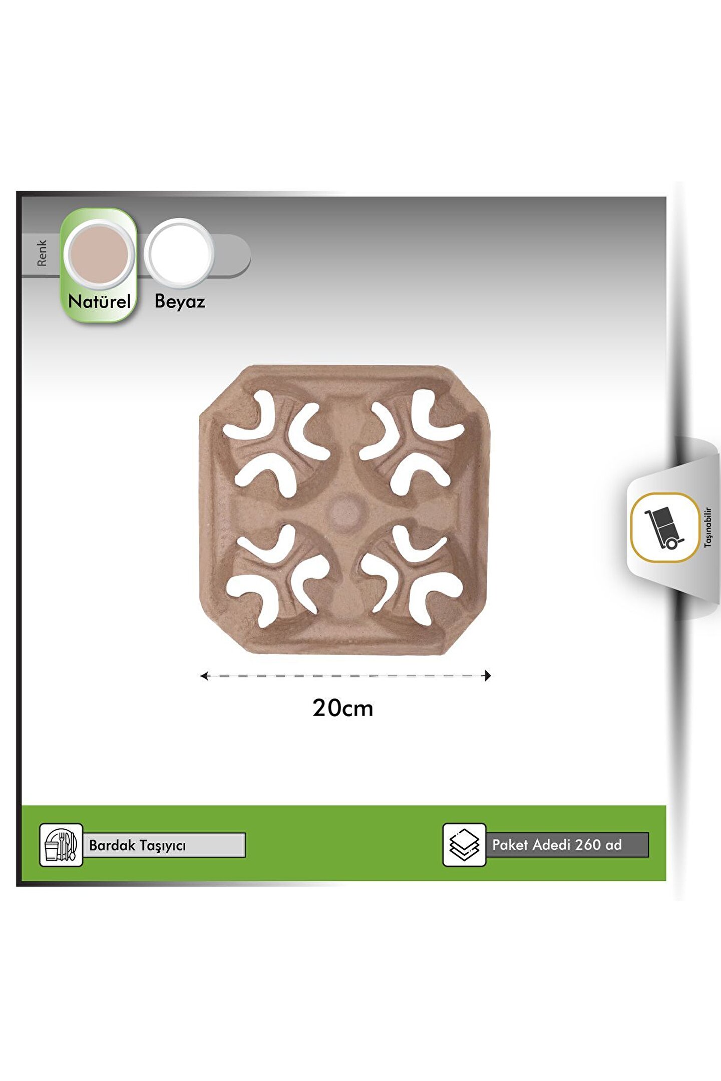 Paket içeriği 100 Adettir. ; 20x19,5x4 cm ebatlarındaki 4 gözlü karton bardak taşıyıcı; viyolden üretilmiş olup, 7, 8, 9 ve 12 oz karton ve plastik bardakların taşınmasına uygundur. ; Bardak taşıyıcı ölçüleri; boy-en ve yükseklik olarak sıralanmaktadır. ; 4'lü viyol bardak taşıyıcı; restoranlar, kafeler, etkinlikler ve self servis işletmeler için mükemmel bir çözümdür. Özellikle sıcak içeceklerin (kahve, çay, sıcak çikolata) güvenli ve rahat bir şekilde taşınmasını sağlar. ;