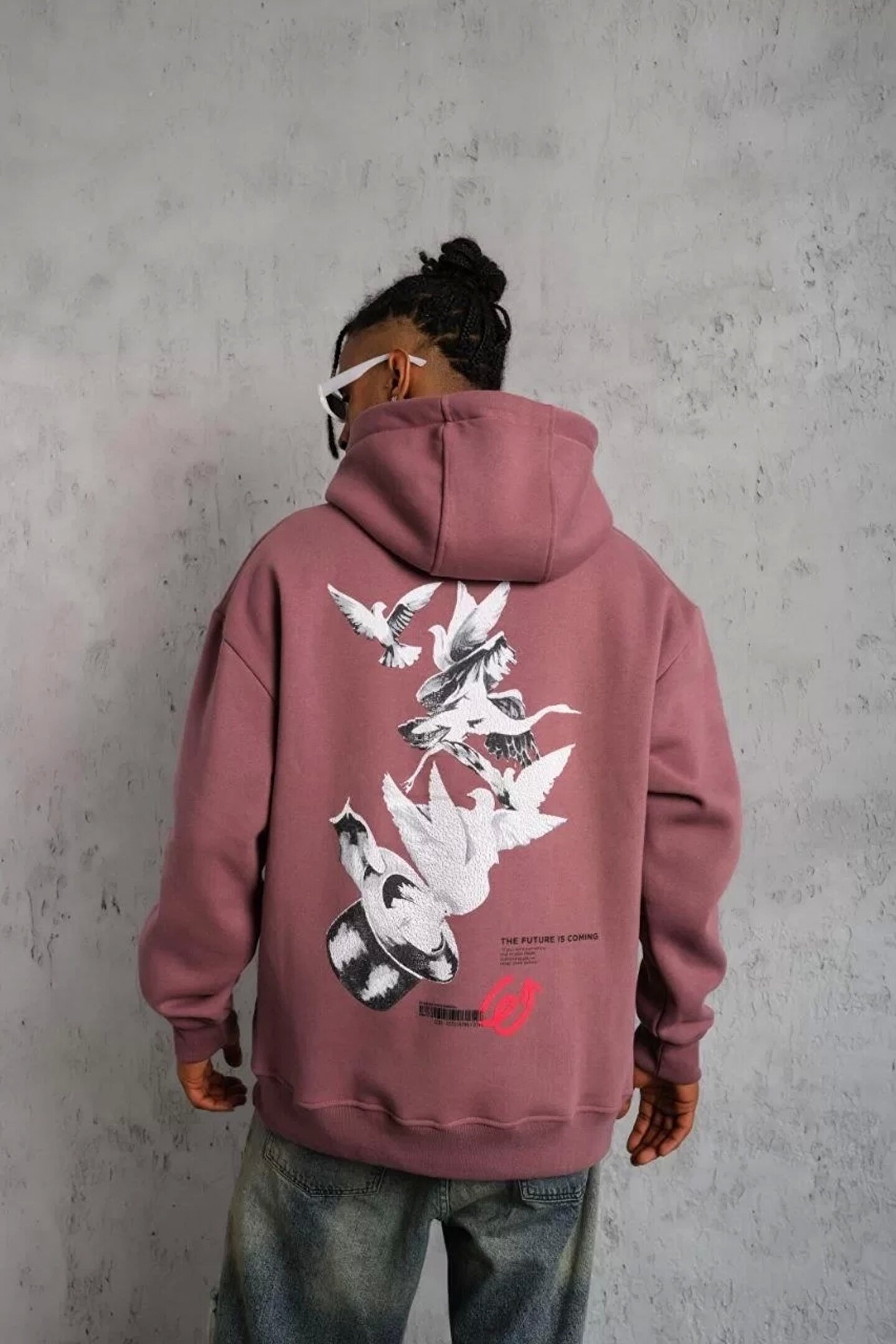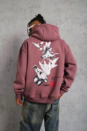 Denzy Erkek Şapkalı Güvercin Baskılı Kapşonlu Sweat - Gül Kurusu