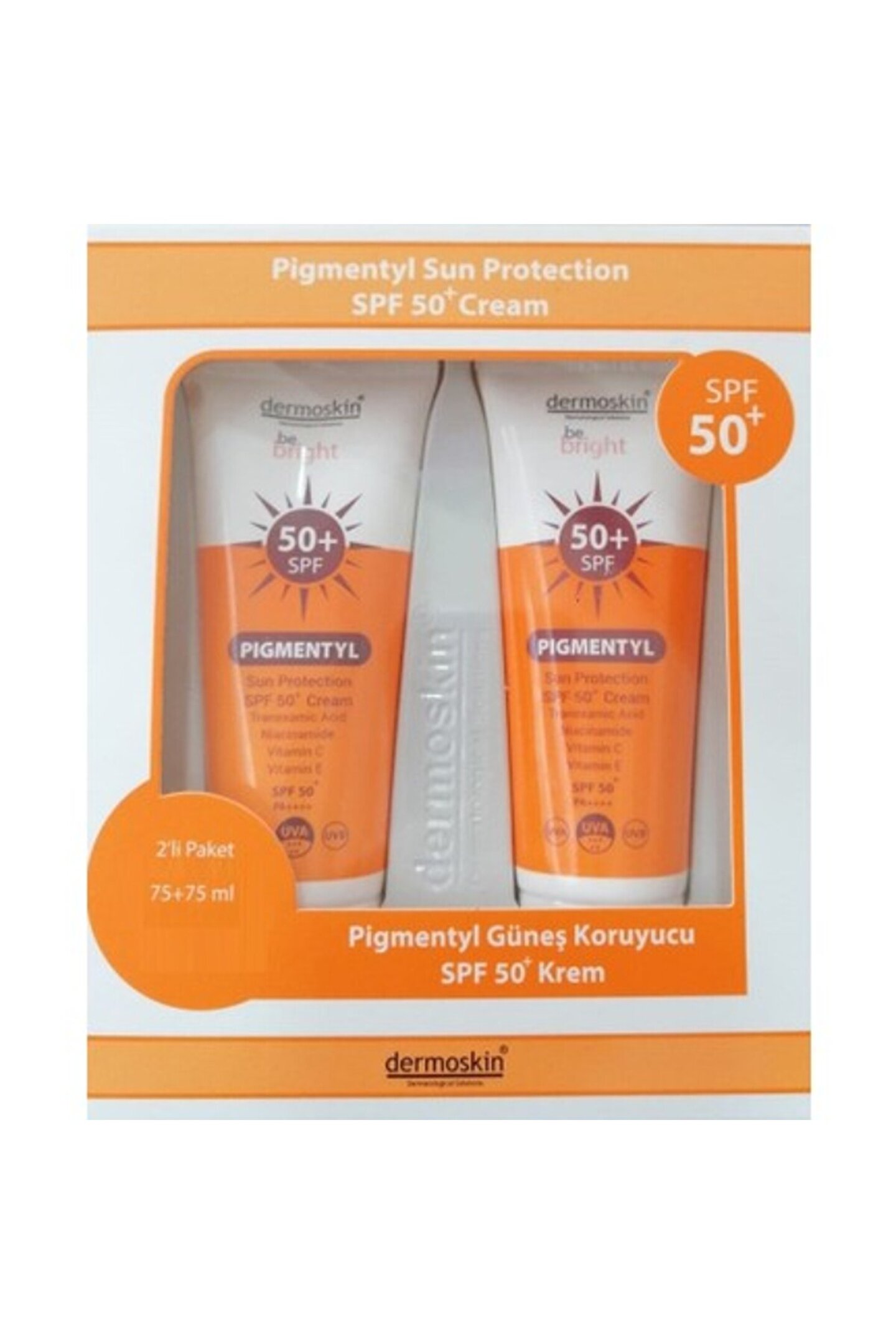 Dermoskin Be Bright Pigmentyl Sun Protection SPF 50+ 75 ml Ürün Markası: DermoskinÜrün Adı: Dermoskin Be Bright Pigmentyl Sun Protection SPF 50+Ürün Boyutu: 75 mlİçindekiler: Tranexamic AsitUygulama Şekli: Ürünü güneşe çıkmadan 20 dakika önce bolca cildinize uygulayın.; Güneşte ve özellikle fiziksel aktivitelerde şiddetli terleme, yüzme ve havlu ile kurulama sonrası her 3-4 saatte bir uygulamayı yenileyiniz.; Öneri: Ürünü düzenli olarak kullanarak maksimum koruma sağlayabilirsiniz.; Faydaları: Leke oluşumunu önler, mevcut lekelerin rengini açmada etkili olur.; Ürün Özelliği: Tüm cilt tiplerine uygun olup, özellikle lekeli veya lekeye yatkın ciltler için formüle edilmiştir.; Türkiye’de ilk kez Tranexamic Acid içeren Dermoskin Be Bright Pigmentyl Sun Protection SPF 50+ güneş koruma kremi, leke oluşumuna özel koruma sağlar.; Bu ürün, leke oluşumunu önlemek ve mevcut lekelerin rengini açmada güçlü bir etkiye sahiptir.; Lekeli veya lekeye yatkın tüm cilt tiplerinin kullanımına uygundur.; Uyarılar Sadece harici kullanım içindir.; 15-25°C arasında oda sıcaklığında, kuru bir yerde, çocukların ulaşamayacağı şekilde ve kapağı kapalı olarak muhafaza ediniz.; Gözle temas etmesi halinde bol su ile durulayınız.2'Li