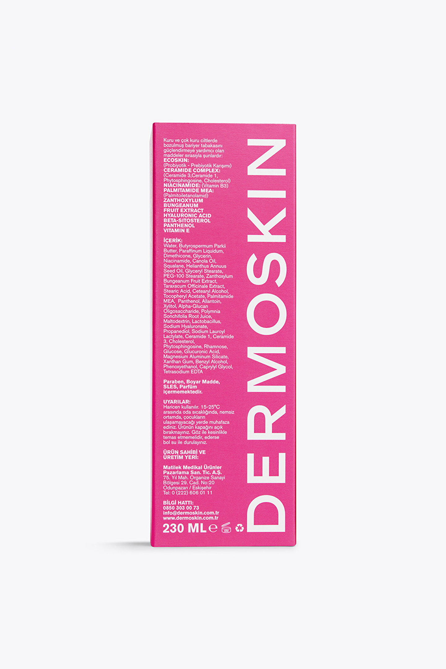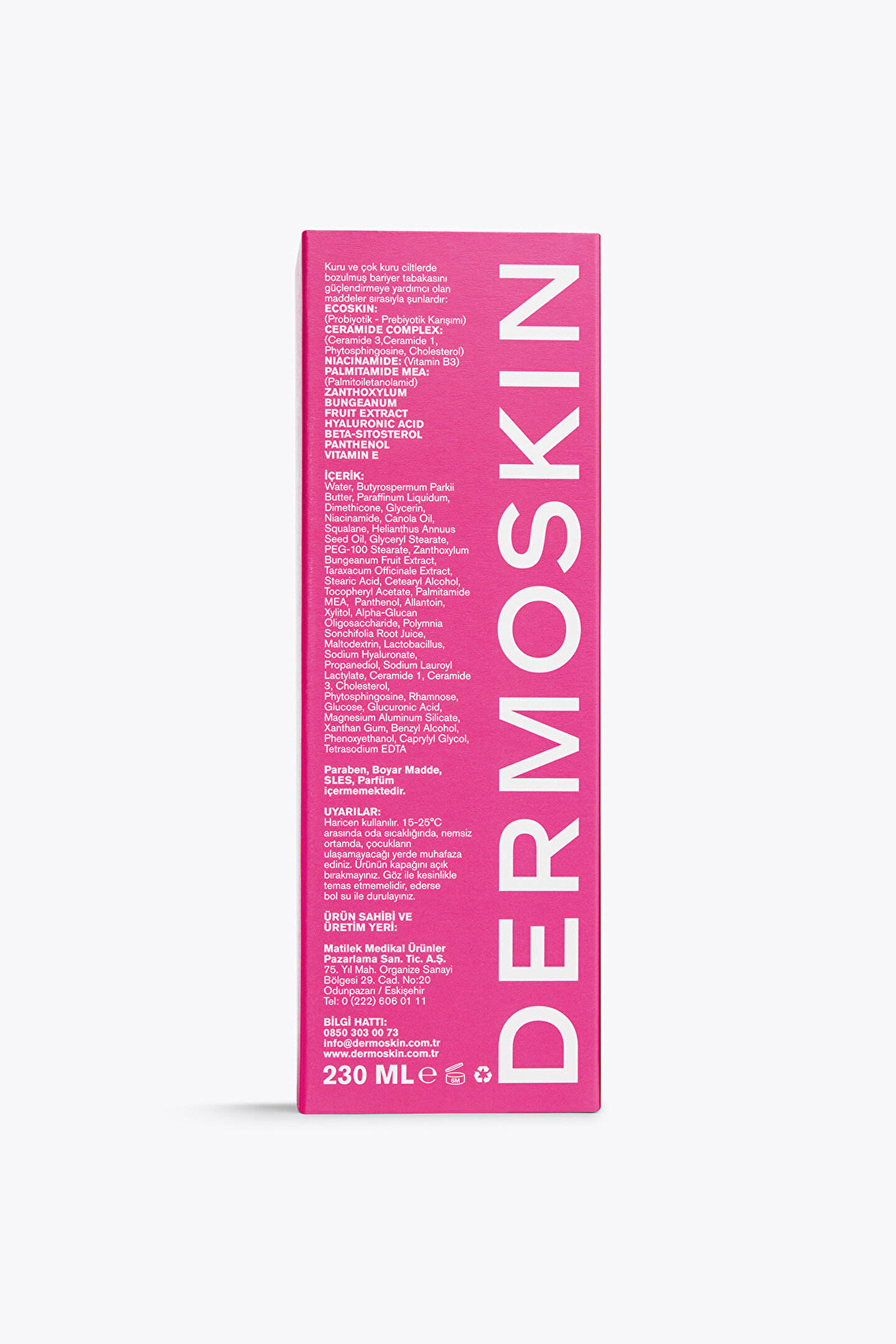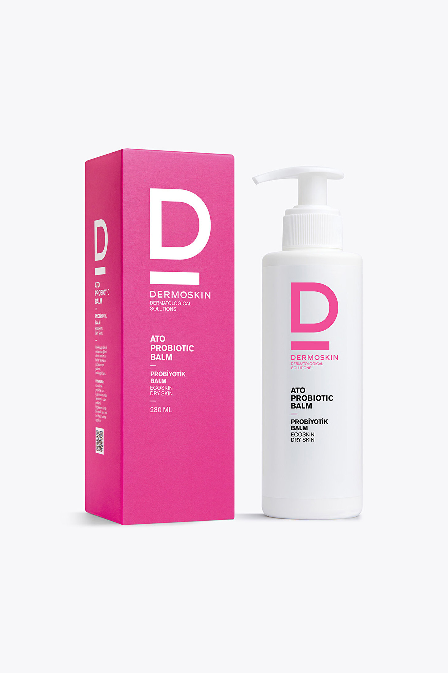 Dermoskin Atoprobiyotik Balm - Vücut Kremi Kuru Ciltler İçin 230 ml;Ürün Markası: Dermoskin;Ürün Adı: Dermoskin Atoprobiyotik Balm;Ürün Boyutu: 230 ml;İçindekiler: Atoprobiyotik bileşenler;Uygulama Şekli: Dermoskin Misel su ile temizlenmiş cildin problemli bölgelerine, günde bir veya iki kere ince bir tabaka halinde uygulanır.;Öneri: Düzenli kullanımda cildin nem dengesini korur ve kuruluğa bağlı problemlerin azaltılmasına yardımcı olur.;Faydaları: Cildi nemlendirir ve yatıştırır, geniş vücut yüzeylerinde kullanıma uygundur.;Ürün Özelliği: Kuru cilt tipleri için uygundur.;Dermoskin Atoprobiyotik Balm, geniş vücut yüzeylerine uygulanmak üzere formüle edilmiştir.; Cildi nemlendirir ve yatıştırır, kuru cilt tipleri için özel olarak geliştirilmiştir.; Düzenli kullanımda cildin nem dengesini korur ve kuruluğa bağlı problemlerin azaltılmasına yardımcı olur.;Uyarılar;Sadece harici kullanım içindir.;15-25°C arasında oda sıcaklığında, kuru ve nemsiz bir ortamda, çocukların ulaşamayacağı yerde ve kapağı kapalı olarak muhafaza ediniz.;Gözle temas etmesi halinde bol su ile durulayınız.