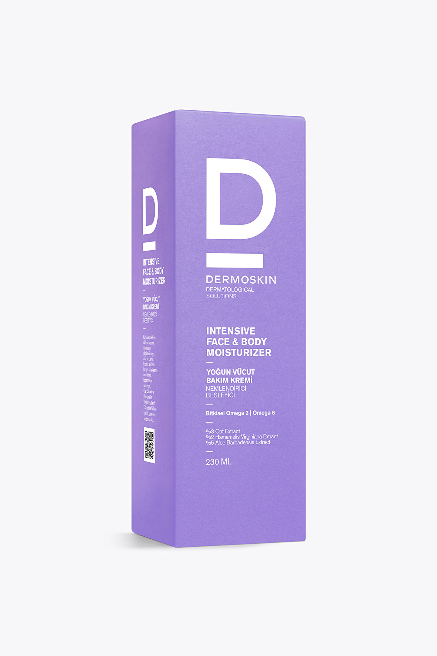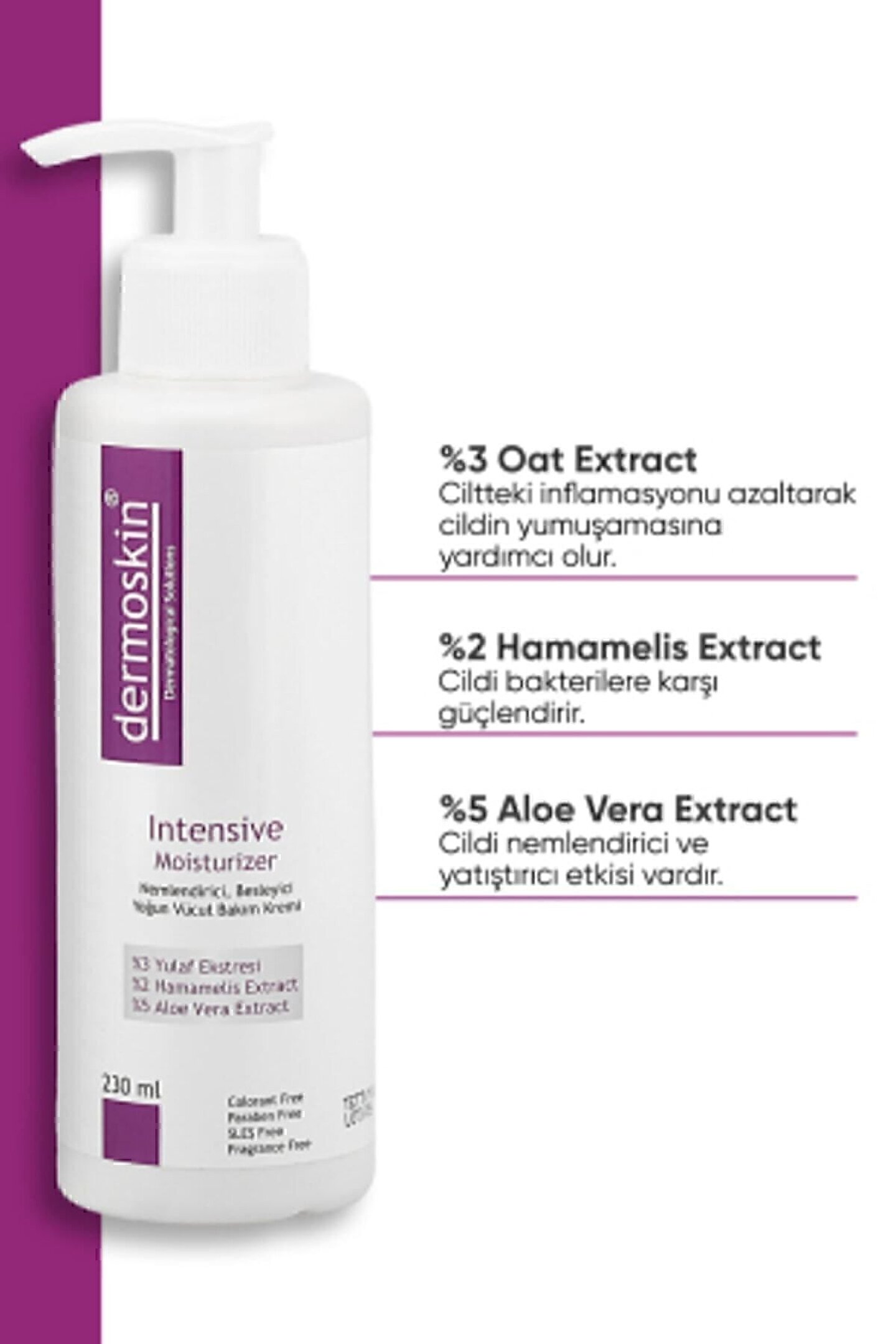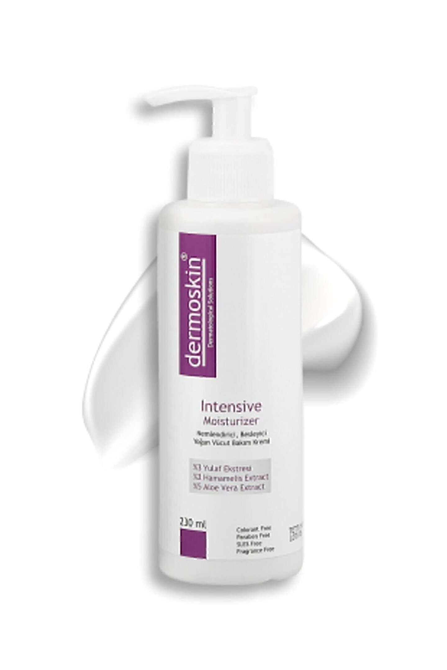 Dermoskin Intensive Moisturizer Vücut Yoğun Bakım Kremi 230 ml vücudunuzu nemlendirmeye ve beslemeye yardımcı olur.; Transepidermal su kaybını önleyerek cildin nem tutma kapasitesini arttırımaya yardımcı olur.; İçeriğindeki etken maddeler ile;; Kuru ve çok kuru ciltlerin koruma tabakasını güçlendirmeye,; Alfa ve Gama Linoleik Asitlerle bariyer tabakasının nem tutma kapasitesini artırmaya yardımcı olur.; CİLT TİPİ Tüm ciltler için kullanıma uygundur.; UYGULAMA ? Temizlenmiş cilde nemlendirme amacıyla doğrudan uygulanabilir.; UYARILAR Haricen kullanılır.; 15-25°C arasında oda sıcaklığında, nemsiz ortamda, çocukların ulaşamayacakları yerde ve kapağı kapalı olarak muhafaza ediniz.; Gözünüze temas etmesi halinde bol su ile durulayınız.;