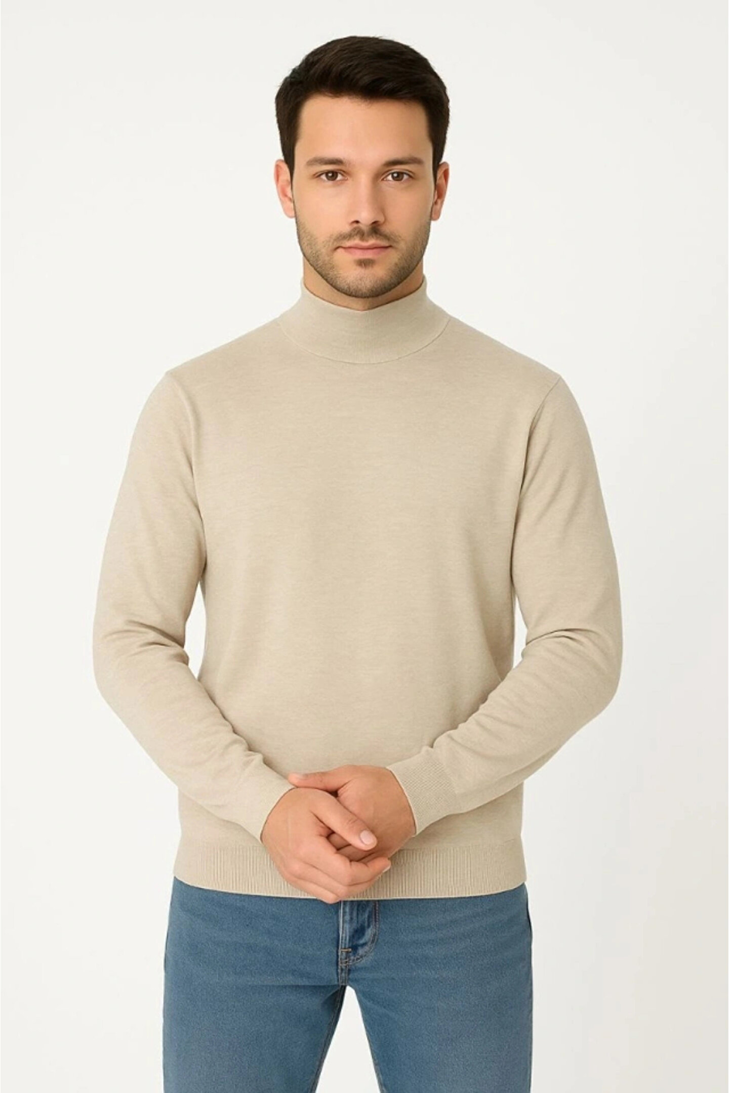Erkek Yarım Boğaz Triko Kazak Yumuşak Dokulu Pamuklu Ince Dokuma, Uzun Kollu Rahat Regular Kalıp - Bej