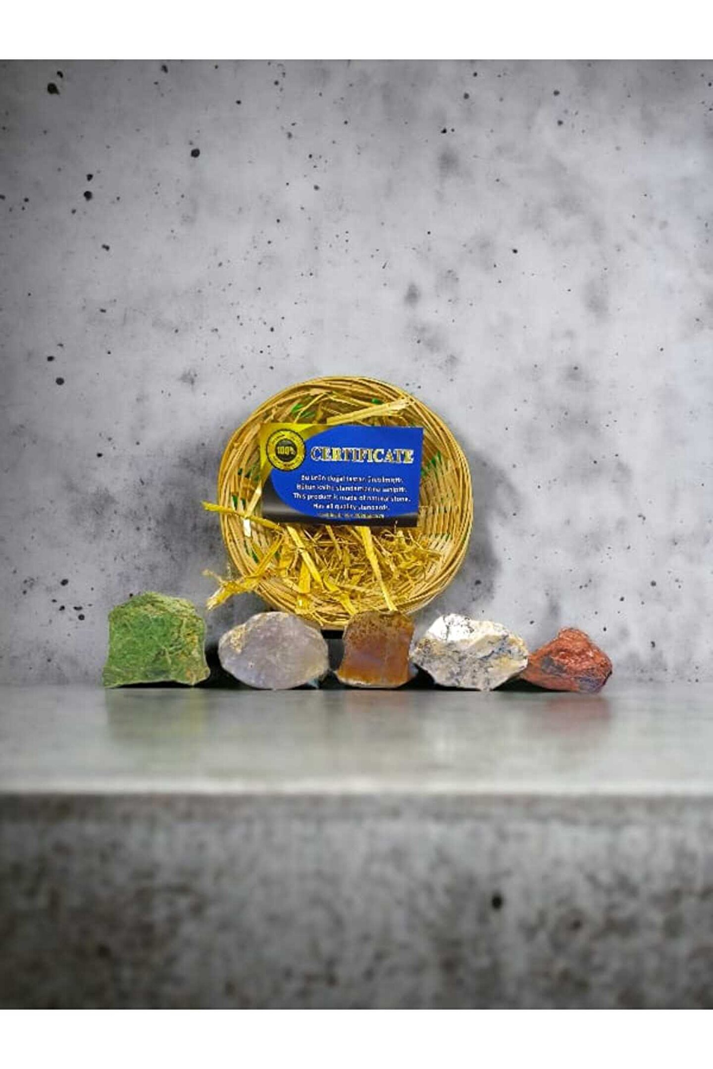 DOĞAL TAŞ CENNETİ 5li ham taş set NAZAR,AĞRIDAN kurtulma (opal,kırmızı jasper,yeşim,kalsedon,akik) hasır sepet dahil