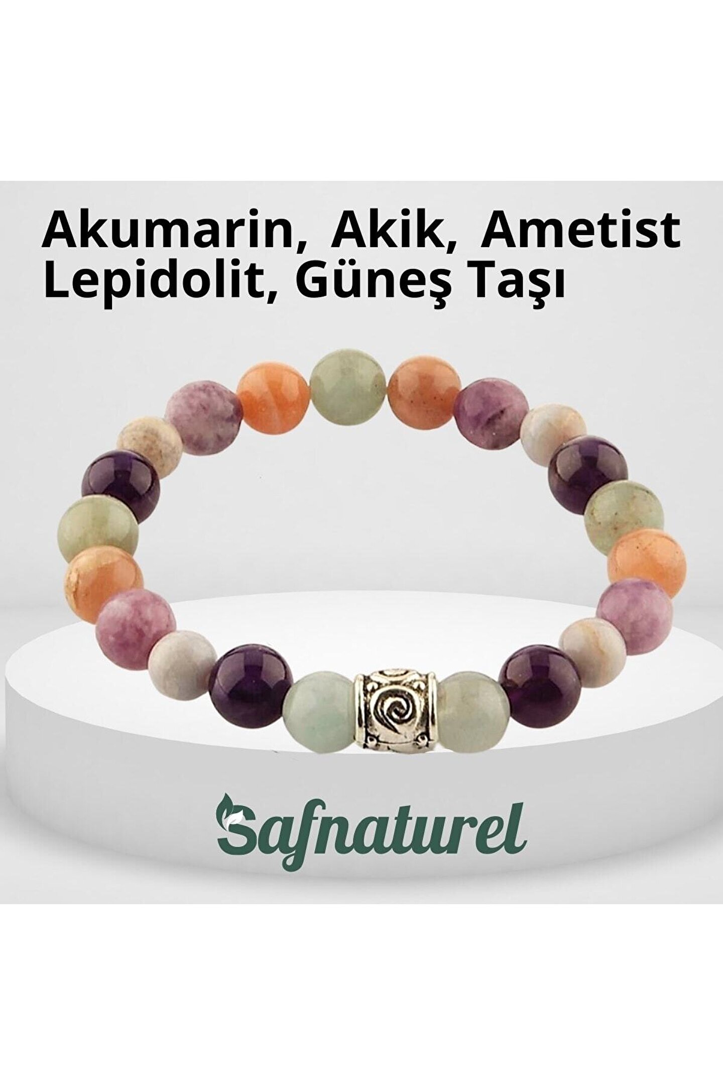 Doğal taş bileklik, şıklığınızı tamamlayacak zarif bir aksesuardır; Akumarin, akik, ametist ve lepidolit gibi değerli taşların birleşimiyle üretilmiştir; Her bir bileklik, benzersiz desenleri ve renkleriyle dikkat çeker; 8 mm boyutundaki bu bileklik, rahat bir kullanım sunar ve bileğinizde zarif bir görünüm sağlar; Doğal taş materyali sayesinde her parça eşsizdir ve doğanın güzelliklerini bileğinizde taşımanızı sağlar;