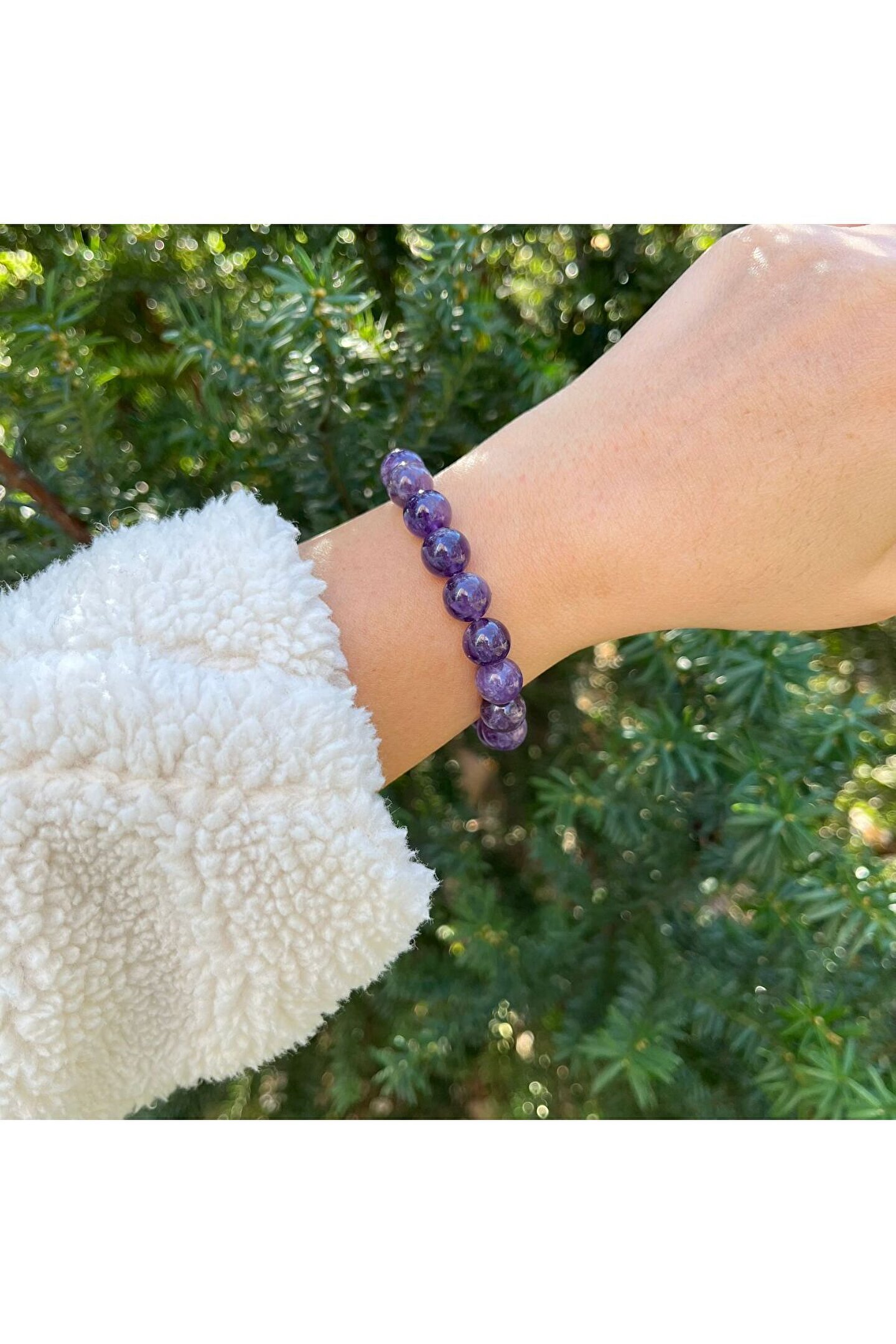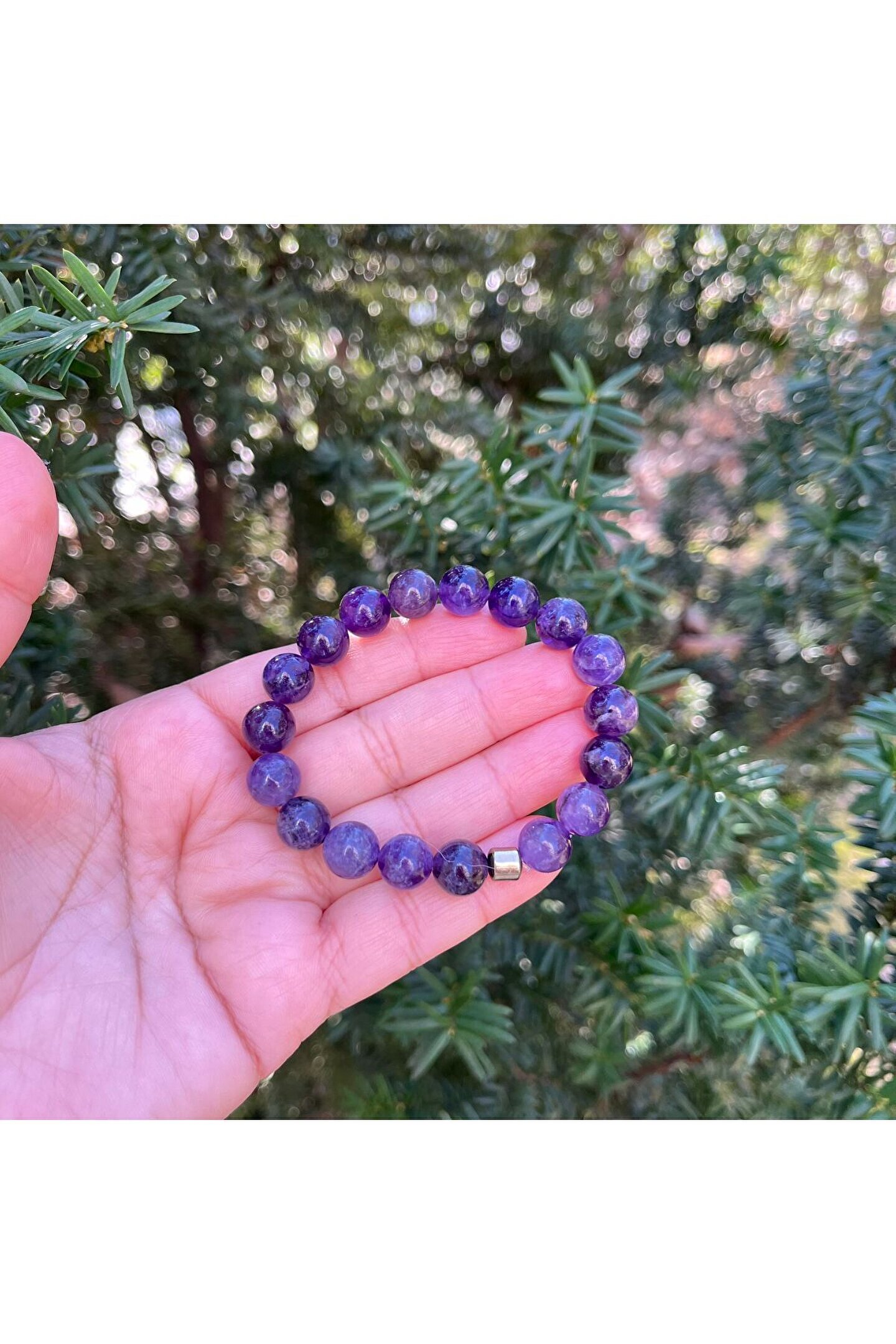 Doğal taş bileklik, şıklığınızı tamamlayacak zarif bir aksesuardır; Ametist taşı, benzersiz renk tonları ve desenleriyle dikkat çeker; 10 mm boyutundaki bu bileklik, hem günlük kullanım hem de özel günler için idealdir; Doğal taş materyali sayesinde her bilek boyutuna uyum sağlar ve konforlu bir kullanım sunar;