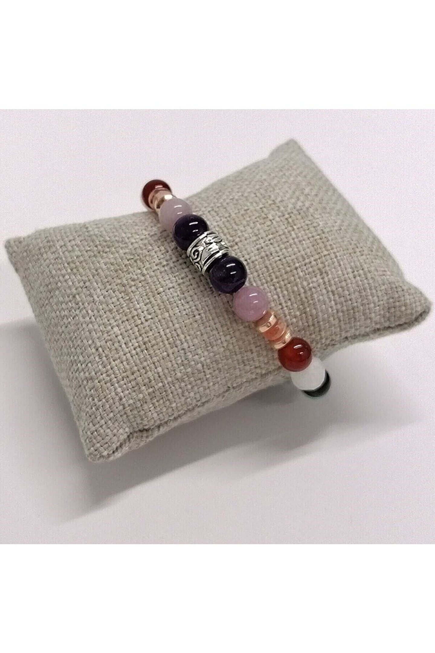 - Doğal taşların eşsiz güzelliğini yansıtan bu bileklik, her kıyafetle uyum sağlayacak şık bir aksesuar seçeneği sunar; - Ametist, pembe kuvars, akik, ay taşı ve kristal kuvars gibi farklı türdeki doğal taşların birleşimiyle zenginleştirilmiş bu bileklik, benzersiz bir dokunuş katıyor; - 8 mm boyutundaki bu bileklik, hem günlük kullanım hem de özel günler için ideal bir aksesuar olarak öne çıkıyor; - Doğal taş materyali sayesinde her bileklik, her bir parça benzersiz ve özgün bir görünüm sergiliyor;