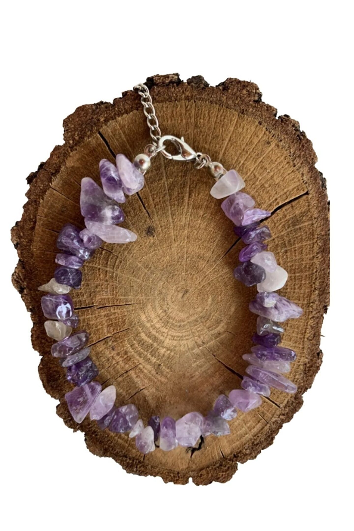 Doğal Ametist taşı kullanılarak üretilmiş, her bir bileklik benzersiz ve özgün bir tasarıma sahiptir; Ametist taşı, şıklığı ve zarafetiyle dikkat çeken bir doğal taş olup, bileklikte doğal güzelliğini ön plana çıkarır; Taşın kırıktaş formu, bilekliğe farklı bir dokunuş katarken, her parça eşsiz bir görünüm sunar; Doğal taş materyali sayesinde hem dayanıklılık hem de estetik bir görünüm sağlar; uzun süreli kullanım için idealdir;