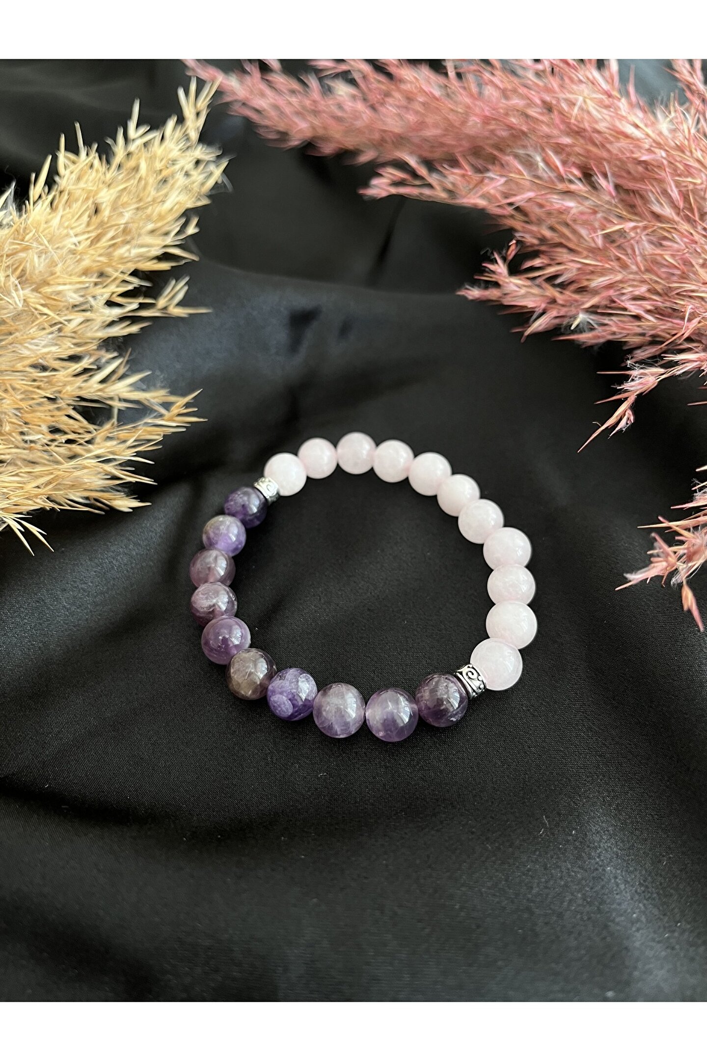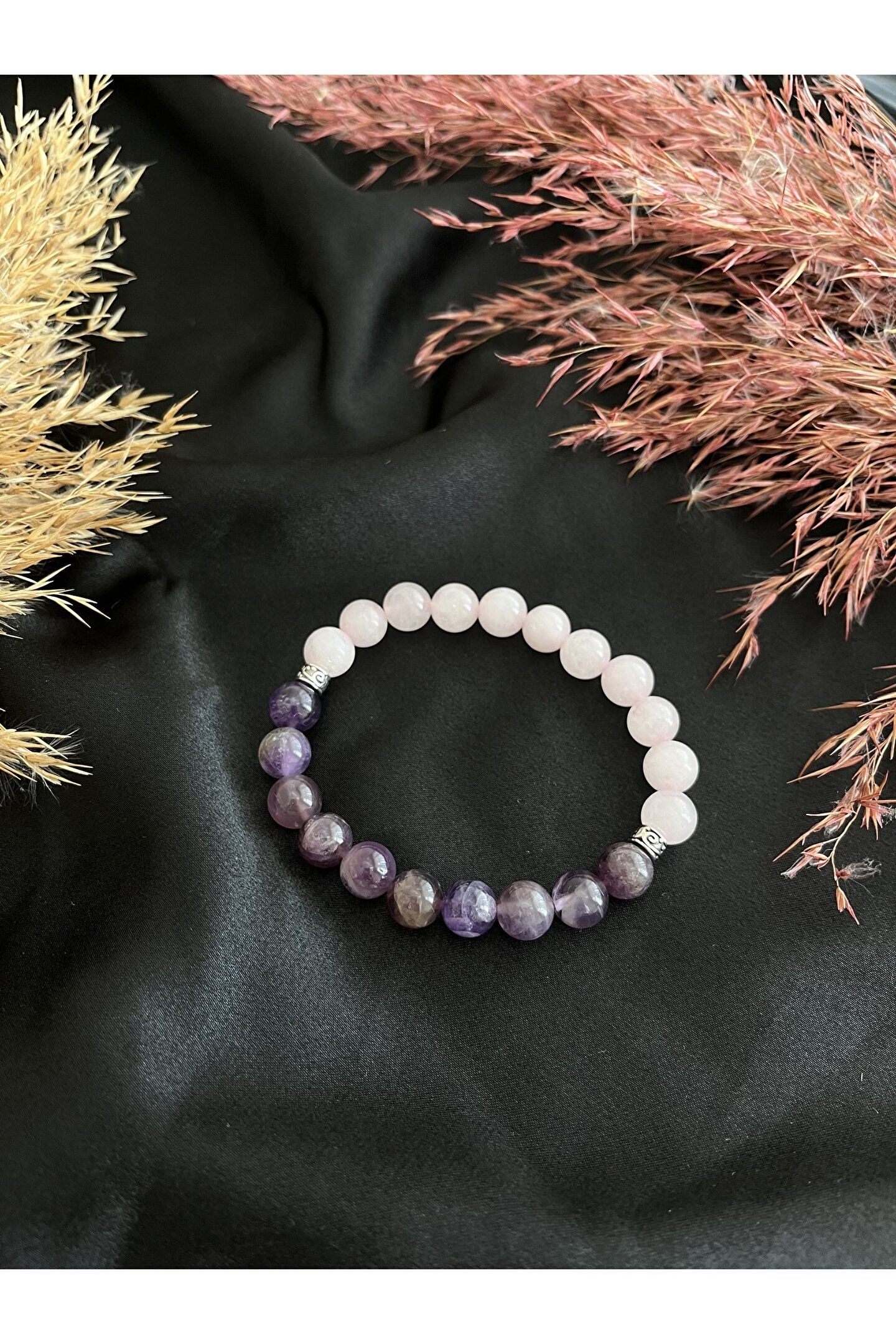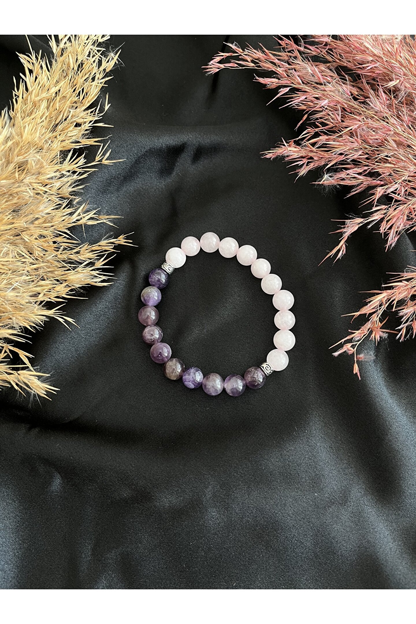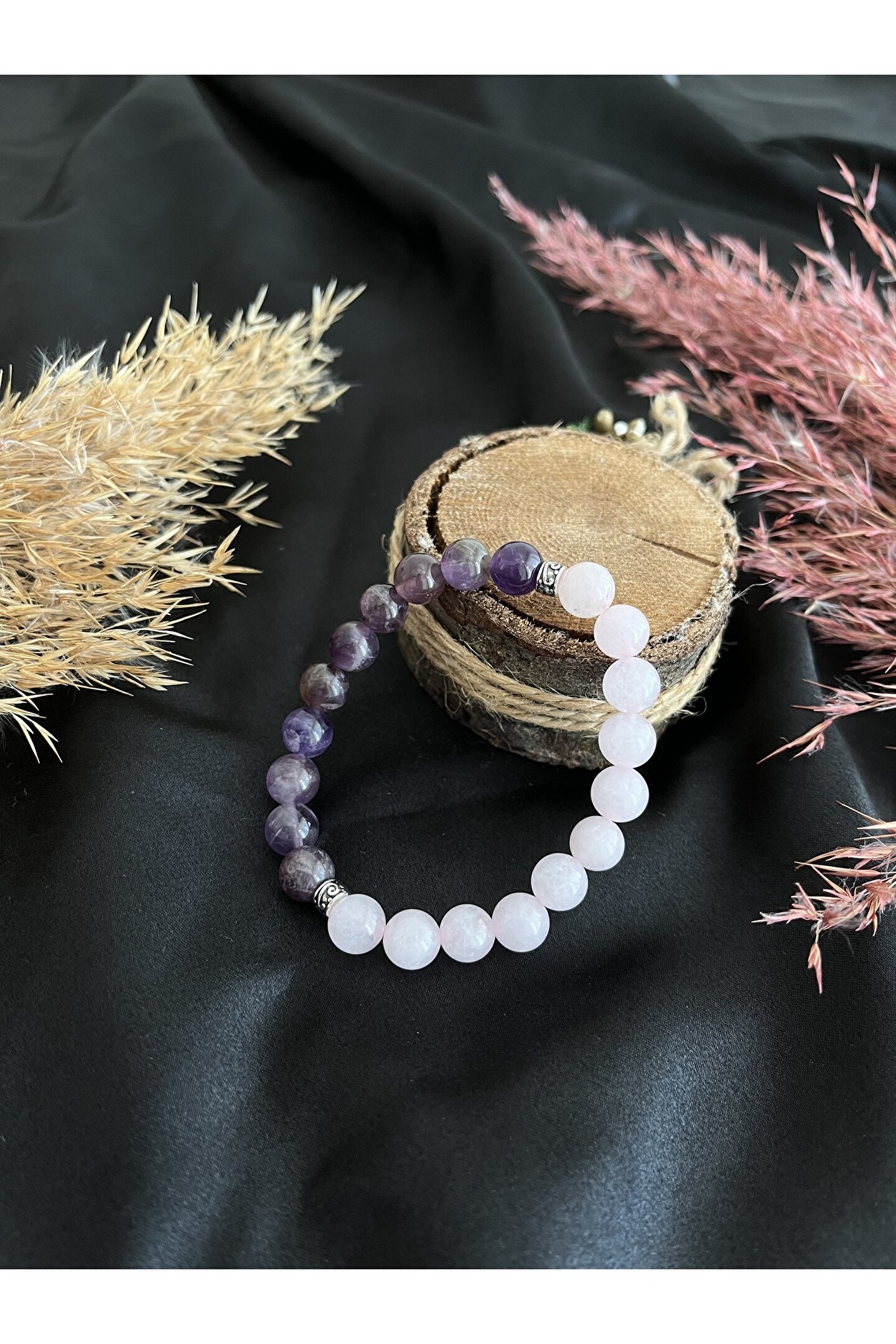 Ametist ve Pembe kuvars taşlarının birlikte kullanımı, estetik açıdan oldukça uyumlu olduğu gibi, güçlü bir enerji ortaya çıkarır.; ; Ametist taşı, depresyonu hafifletir ve anksiyete ile başa çıkmayı kolaylaştırır.; ; Pembe kuvars taşı ise, öz sevgiyi teşvik eden, sevgi enerjisi ile dolu bir kristaldir.; ; ÜRÜN BİLGİSİ: Bileklik 8 mm Ametist ve Pembe kuvars doğal taşlarının muhteşem uyumuyla tasarlanmıştır.; ; Taşlarımız gerçek doğal taştır.; ; Doğal taşlar tabiatı itibariyle kendine özgü biçimdedir ve aynı taş cinslerinde dahi ufak tefek renk tonu ve biçim farklılıkları görülebilir.; ; Bu taşın doğadaki doğal oluşumuyla ilgilidir.; ; Belli aralıklarla topraklama yöntemiyle taşınızın enerjisini temizleyip taşlarınızı arındırabilirsiniz.;