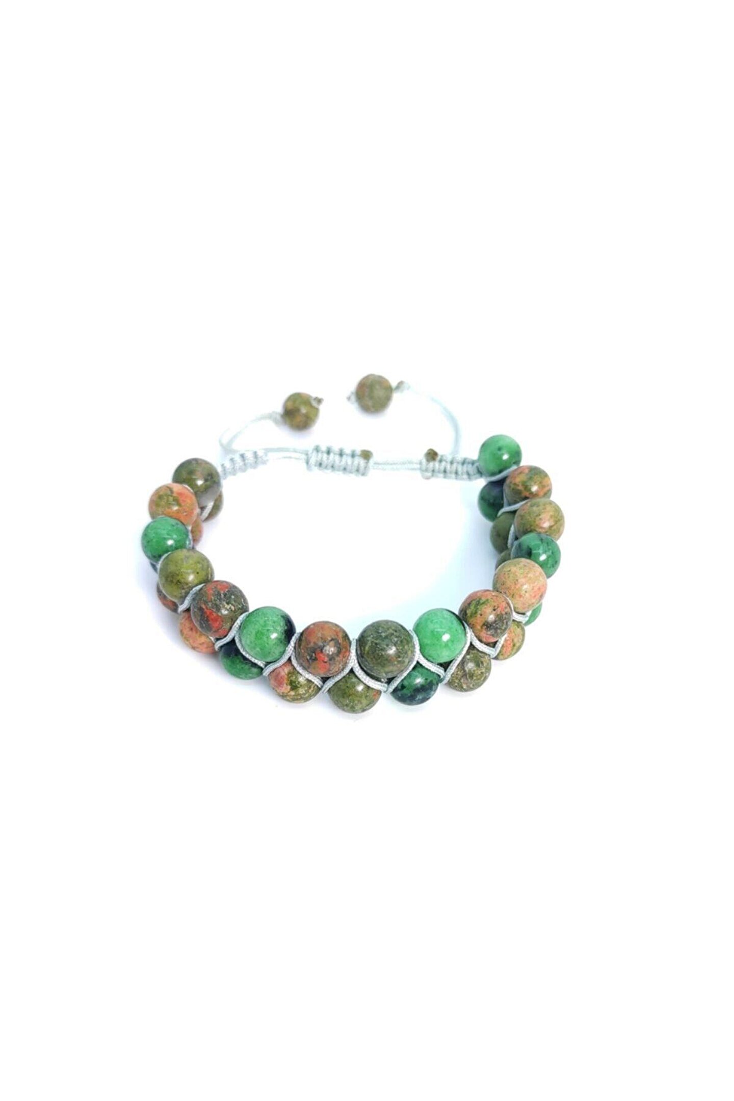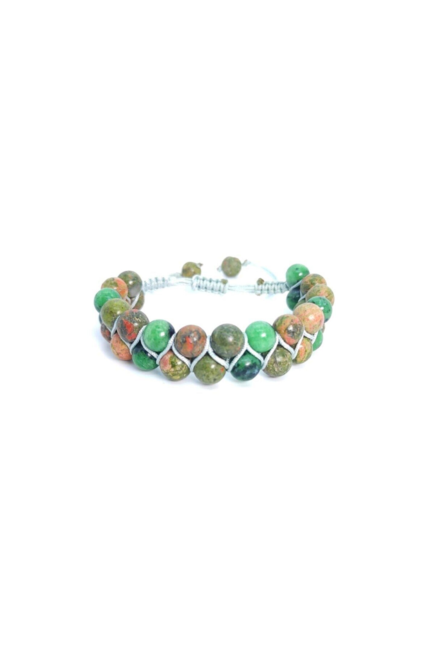 Doğal taş kullanımı sayesinde her bileklik benzersiz ve otantik bir görünüm sunar; Çift sıra örme tasarımı, bilekliklere zarif bir dokunuş katar ve şıklığınızı tamamlar; Her bir bileklik, el yapımı olup, özenle seçilmiş taşlarla özenle işlenmiştir; Doğal taşların renk ve desen çeşitliliği ile her türlü kıyafetle uyum sağlar ve stilinizi öne çıkarır;