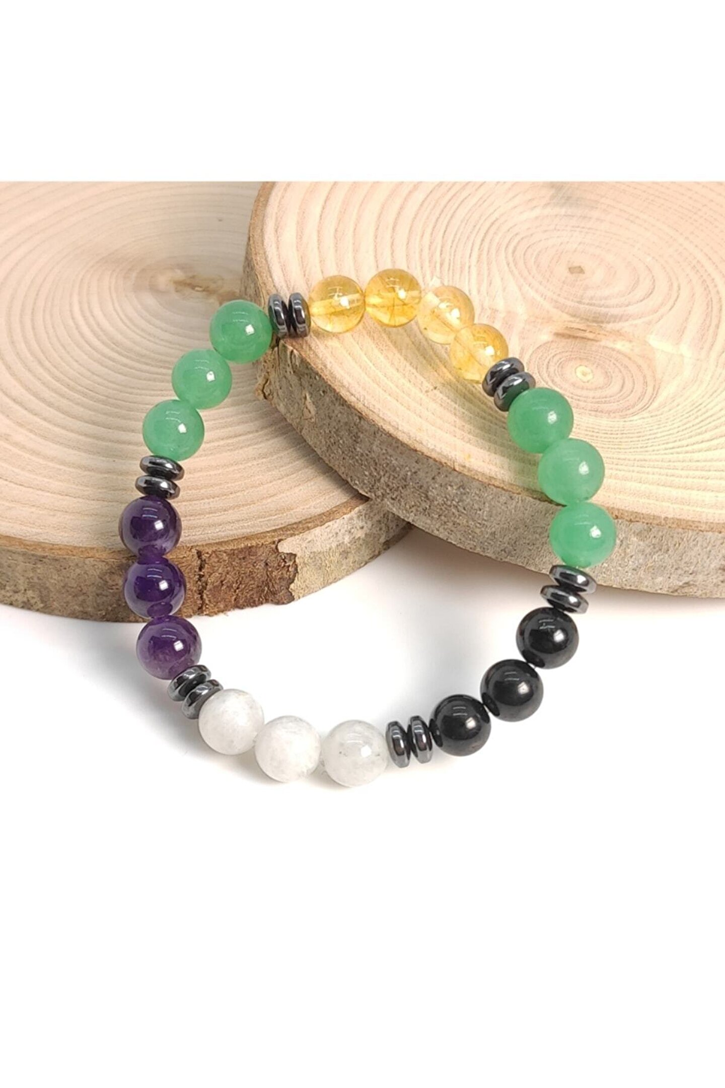 - Doğal taş kullanımı sayesinde, her bileklik benzersiz ve otantik bir görünüm sunar; - Ay taşı, ametist, siyah turmalin ve sitrin gibi enerji taşı türleri, bilekliğe şık bir dokunuş katar; - Enerji bilekliği olarak tasarlanmış bu bileklik, kişisel enerjinizi dengelemenize yardımcı olabilir; - Doğal taşların sunduğu zarif ve doğal güzellik, günlük kullanım için idealdir;