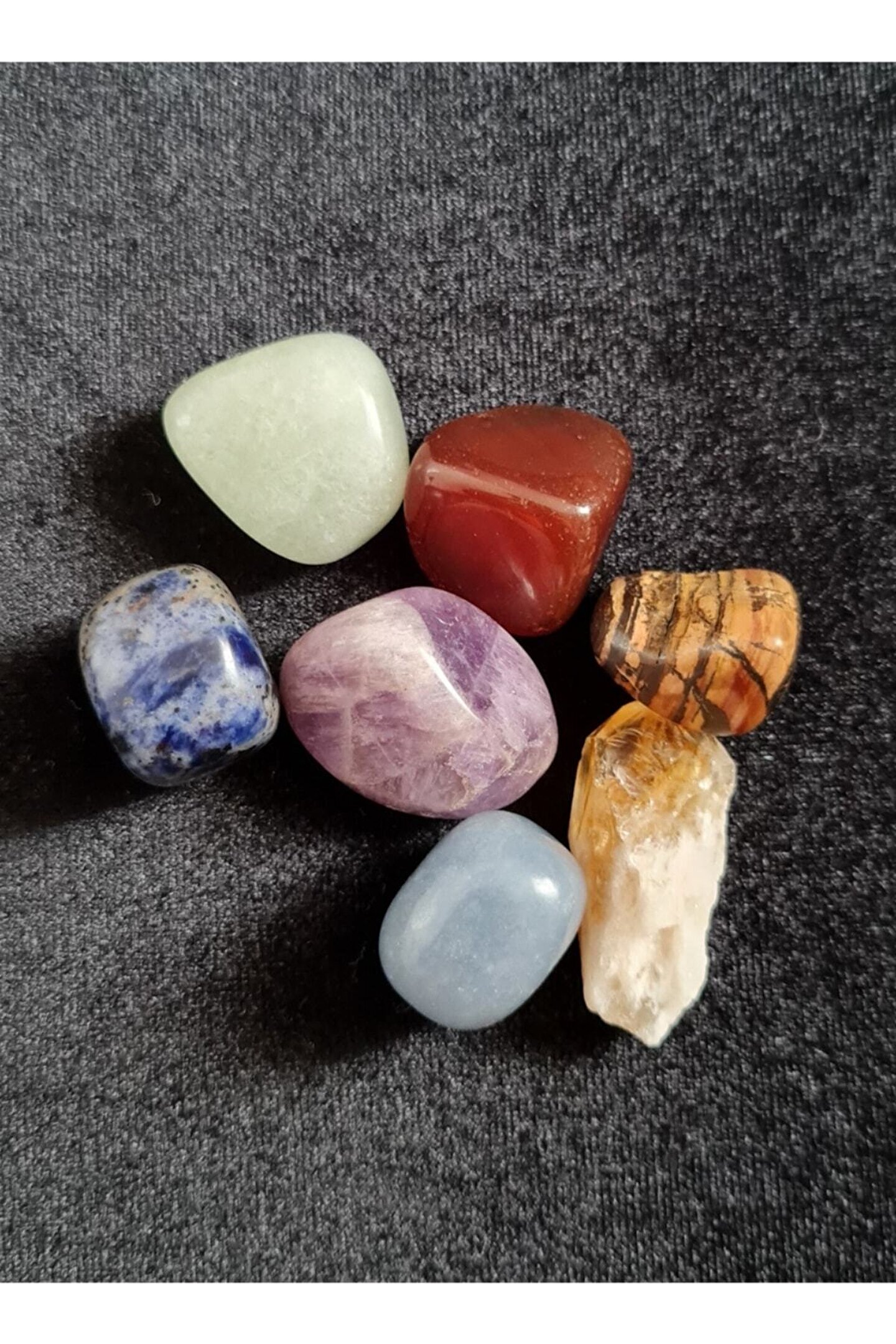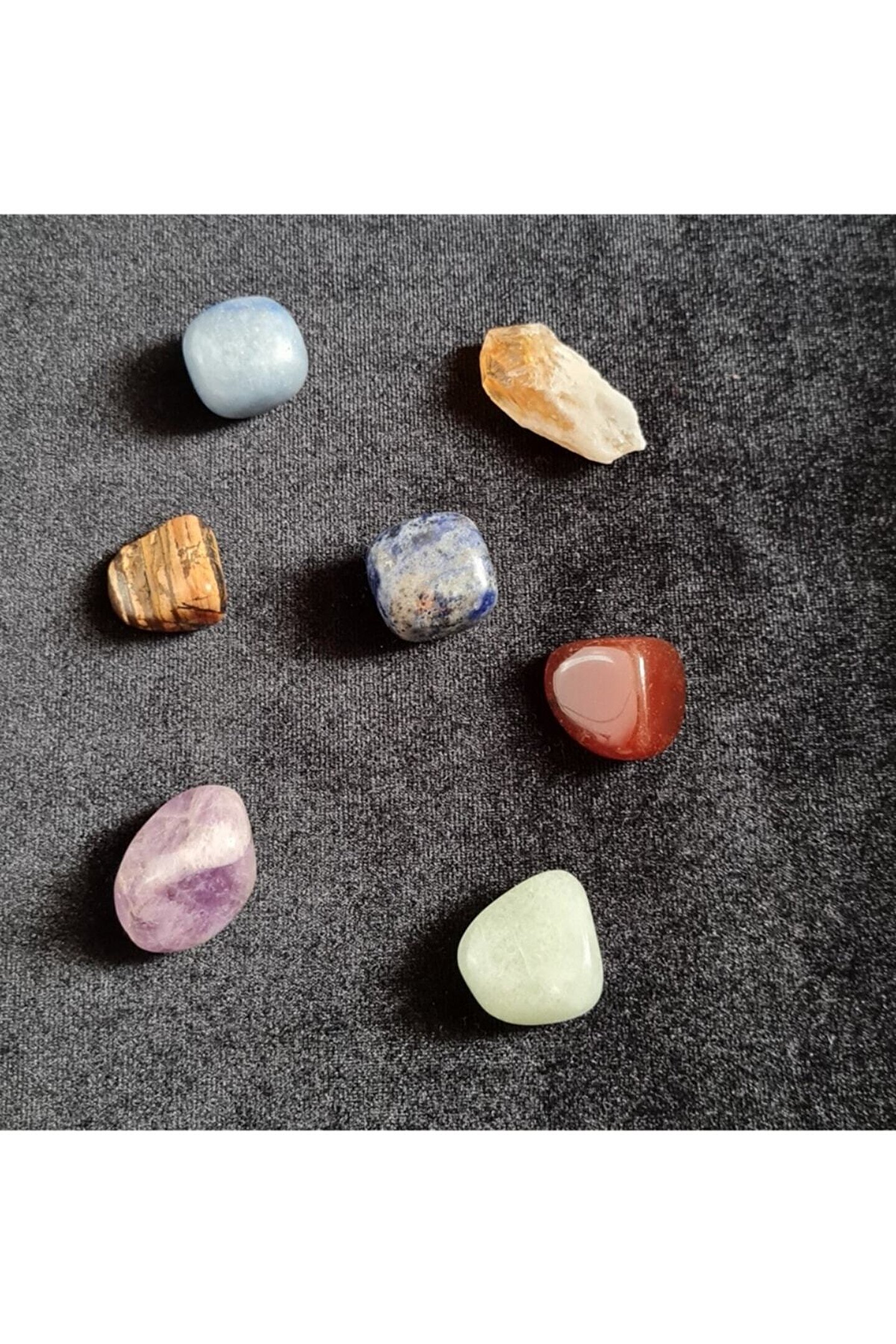 Setteki Taşlar ; Ametist, Sodalit, Aventurin, Kaplangözü, Sitrin, Kırmızı Akik Bedenimizdeki 7 çakrada yasam enerjimiz sürekli bir akıştadır.; ; Çakra taşları çakraların dengelenmesi, tıkanıklıkların açılması için gereken enerjiyi verir.; ; Her taşın farklı frekansı vardır ve kullandığımız sürece bize gereken şifayı aktarırlar.; ; Siparişinizde yedi adet görseldeki taşlardan gönderilecektir.; ; Meditasyon taşı olarak kullanabilirsiniz.; ; Su içtiğiniz kabta bekleterek suyun hafızasını tazeleyip şifalı kılabilirsiniz.; ; Baş ucu taşı ya da yastık altında kullanıp enerji için fayda alabilirsiniz.; ; -Hamilelik sürecinde yakınınızda tutmakta faydaları var.; ; -Dolunay zamanında dolunay ışığında sabaha kadar bekletebilirsiniz.; ; -Ara ara güneş banyosu ya da akan suda bekletilerek ya da tütsüleyecek enerjisi temizlenmeli ve tazelenmelidir 10-20 GR (Adet ağırlıkları farklılık göstermektedir) ;