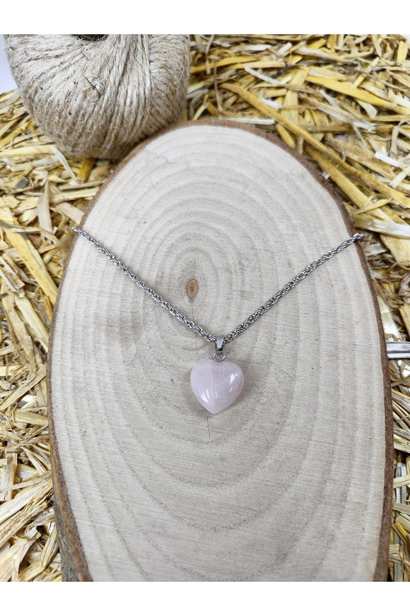 DOĞAL TAŞ CENNETİ Doğal Kalp Kesim Pembe Kuvars Taşı Kolye (sertifikalı) (47 Cm Zincir Dahil)