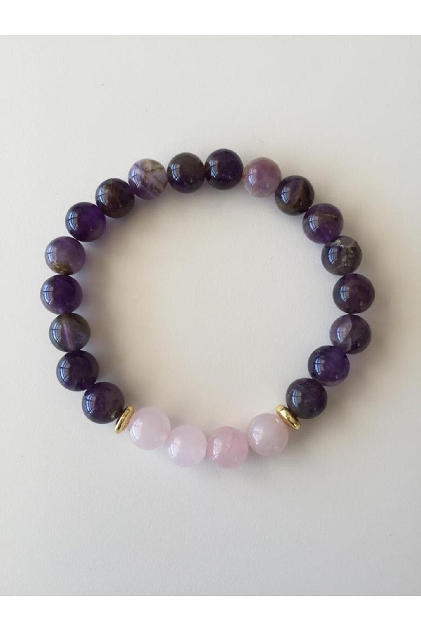 Bu üründe kullanılan Doğal taş Ametist ve Pembe Kuvars takriben 8mm çapındadır. ; Elastik yapıda olduğu için her yaşa uygundur. ; Doğal taşları parfüm,saç spreyi ,deterjan,krem, sabun vb. ; kimyasal ürünlerden koruyunuz. ; Aksi takdirde doğal taş etkinliğini kaybedecektir. ; Doğal taşınızı 10-15 gün aralıklarla toprakta 24 saat bekleterek temizleyebilirsiniz. ; Ametist son derece güçlü ve koruyucu bir taştır. ; Çevresindeki enerjileri sevgiye dönüştürür, ataklara karşı koruyucudur, Doğal bir sakinleştiricidir. ; Strese karşı korur. ; Meditasyon taşıdır. ; Ametist kristali güçlü şifa ve arındırma özelliklerine sahiptir. ; Bağımlılıkları yok eder.Zihin için son derece faydalıdır. ; Farkındalığı arttırır. ; Odaklanmayı kuvvetlendirir, zihinsel dağınıklığı iyileştirir. ; Ametist karar alma mekanizmasını da çalıştırır, sağduyu ve iç görü sağladığı gibi fikirleri hayata geçirme açısından da netlik sağlar. ; Pembe kuvars Zihinsel konsantrasyonu arttırdığı bilinir. ; Baş ağrılarını hafifletici etkileri vardır. ; Radyosyonu toplayıcı etkileri vardır. ; Çevrede oluşan negatif enerjiyi yok eder ve pozitif enerjiye çevirir.;