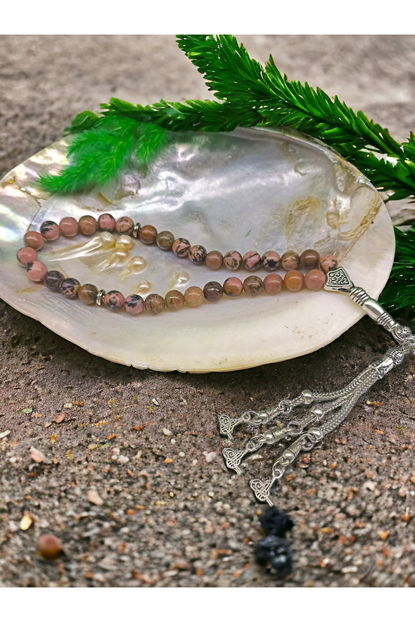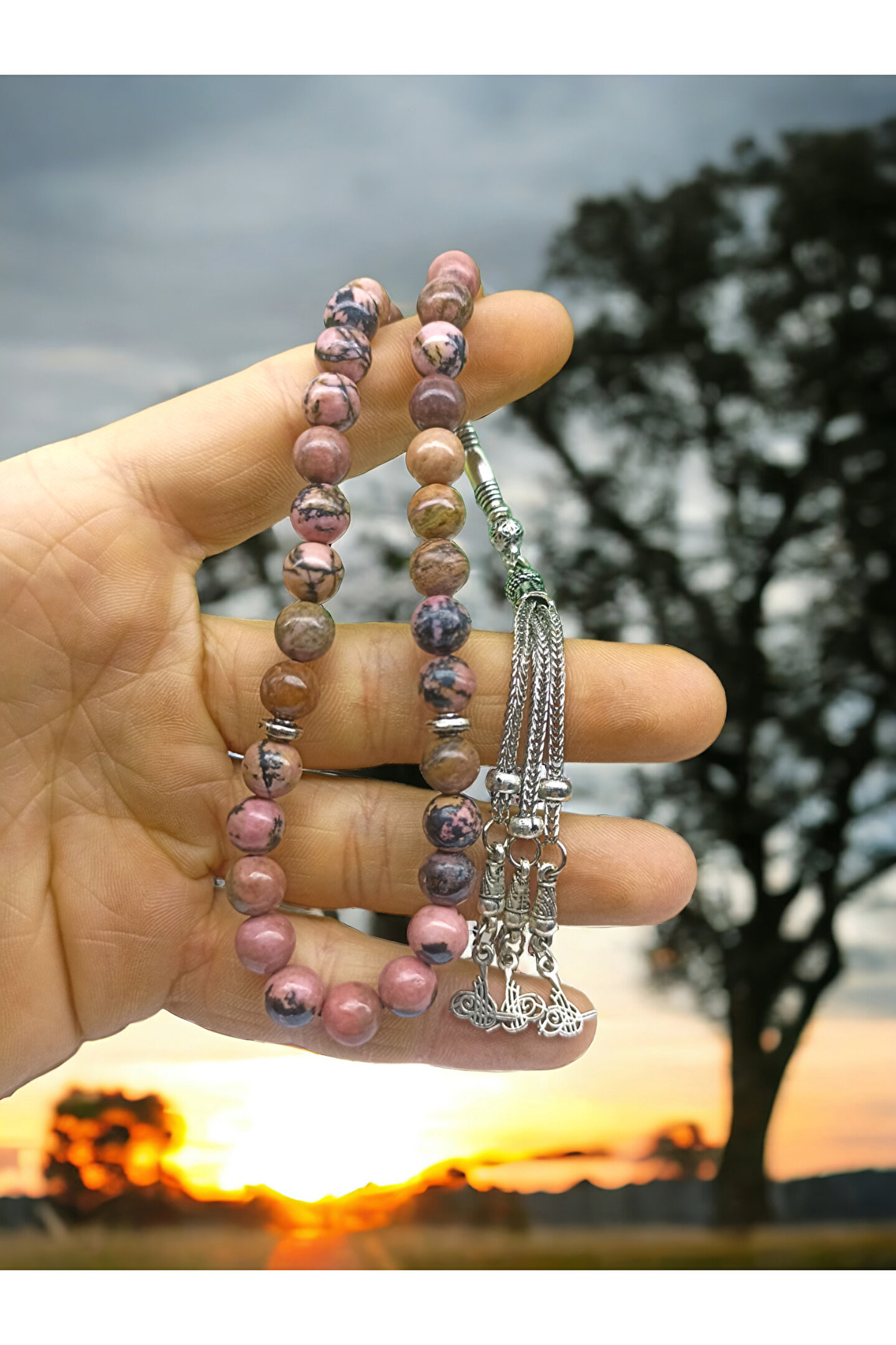 Doğal taş rodonit kullanılarak üretilmiş, her bir tesbih taşı benzersiz desen ve renklerle süslenmiştir; Gümüş kaplama detayları ile zenginleştirilmiş, şık ve modern bir görünüm sunar; Sertifikalı özel kutusunda sunulan bu tesbih, hem kaliteyi hem de estetiği ön planda tutar;