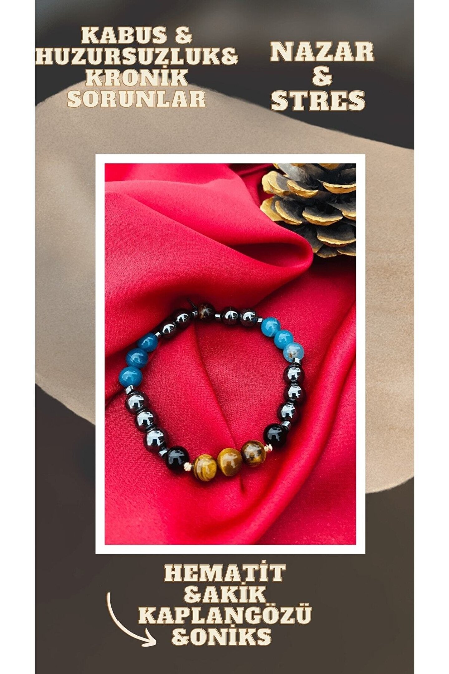 İyi şans Bileklik & Kabus& Huzursuzluk&Kronikleşmiş Sorunlar&Nazar Korunma Hematit Akik Kaplangözü Oniks Taşlarının biraradaki eşsiz keyifli dizilimi kişiye ruhani olarak iyi gelmektedir.; ; Tüm toksisite olmuş enerji ve toksinlerin atılmasına yardımcı olur, nötralize eder, bedeni ve zihni arındırır.; ; · Kalp ve karın kök mide alın sakral çakralarını açar.; ; Kişisel gelişim için en ideal taştır.; ; Sevinç, neşe ve mutluluk gibi duyguların kişiye akmasını yardımcı olur.; ; Enerjinizi arttırır ve yaratıcılığınızı harekete geçirir.; ; Bilgileri kolayca anlamaya ve kavramaya yardımcı olur.; ; Denge ve pozitif düşünceyle birlikte enerji artırma açısından etkili bir taştır.; ; Sosyalleşmeyi veya sosyal ortama uyum sağlamayı özgüven duygusunu kolaylaştırır.; ; beden zihin dengesini sağlayan bir taştır.; ; Kişiye olumlu düşünme iyimserlik duygusu verir.; ; Aşırı kaygılanmaları önler.; ; Olumsuz kalıpları serbest bırakmaya ve aşk ve sevinci hayatınıza davet etmeye yardımcı olur.; ; Sıkça tekrarlayan olumsuz yaşam döngüsünden çıkmayı kolaylaştırır… Esnek misinalı model Topraklı kutuda topraklanarak iletilmektedir Bileklik size gelmeden topraklanarak enerjisini şarj etmektedir.; ; Taşıma esnasında kişilerin enerjisinden etkilenmeden doğrudan size ulaşmış olmaktadır.; ; Doğrudan kullanıma uygundur Kullanma kılavuzu ve sertifikalı olarak iletilmektedir.; ; 22 taş olarak hazırlanmaktadır;