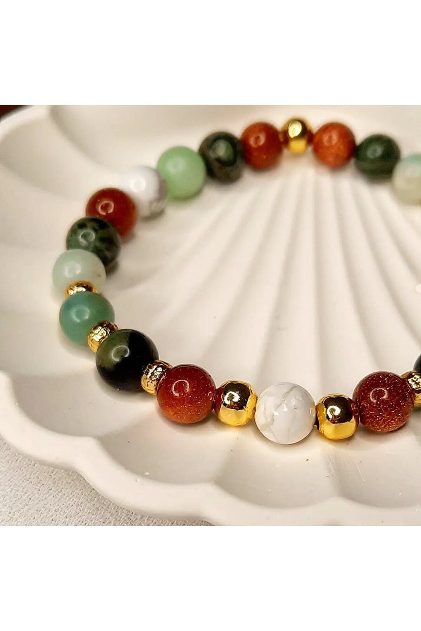 - Doğal taş bileklik, şıklığınızı tamamlayacak zarif bir aksesuardır; - Yıldız taşı ve havlit jasper gibi özel doğal taşlar kullanılarak üretilmiştir, bu da her bilekliğe benzersiz bir karakter katar; - Amazonit taşı, bilekliğe canlı ve göz alıcı bir parlaklık kazandırırken, havlit jasper ise dayanıklılığı ve estetiği bir arada sunar; - Doğal taş materyali sayesinde her bileklik, doğanın saf güzelliğini parmaklarınıza taşır;