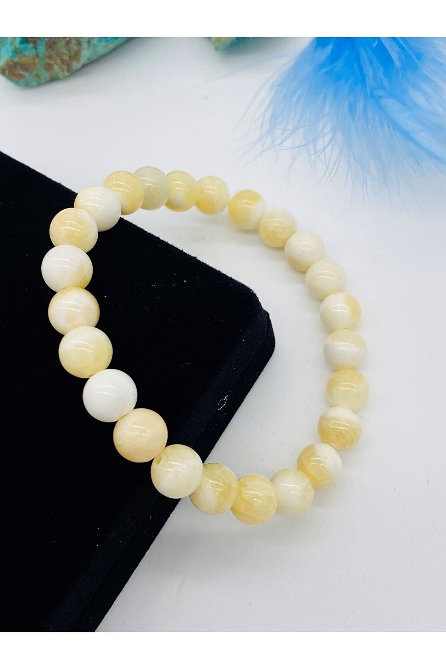 Doğal kalsit taşı kullanılarak üretilmiş, her bir bileklik benzersiz ve özgün bir tasarıma sahiptir; Doğal taş materyali sayesinde, bileklik hem şık hem de doğayla iç içe bir görünüm sunar; 8 mm kalınlığındaki bileklik, rahat bir kullanım sağlarken zarif detaylarıyla dikkat çeker; Kalsit taşı, bilekliğe doğal bir parlaklık kazandırarak her türlü kıyafetle uyum sağlar;
