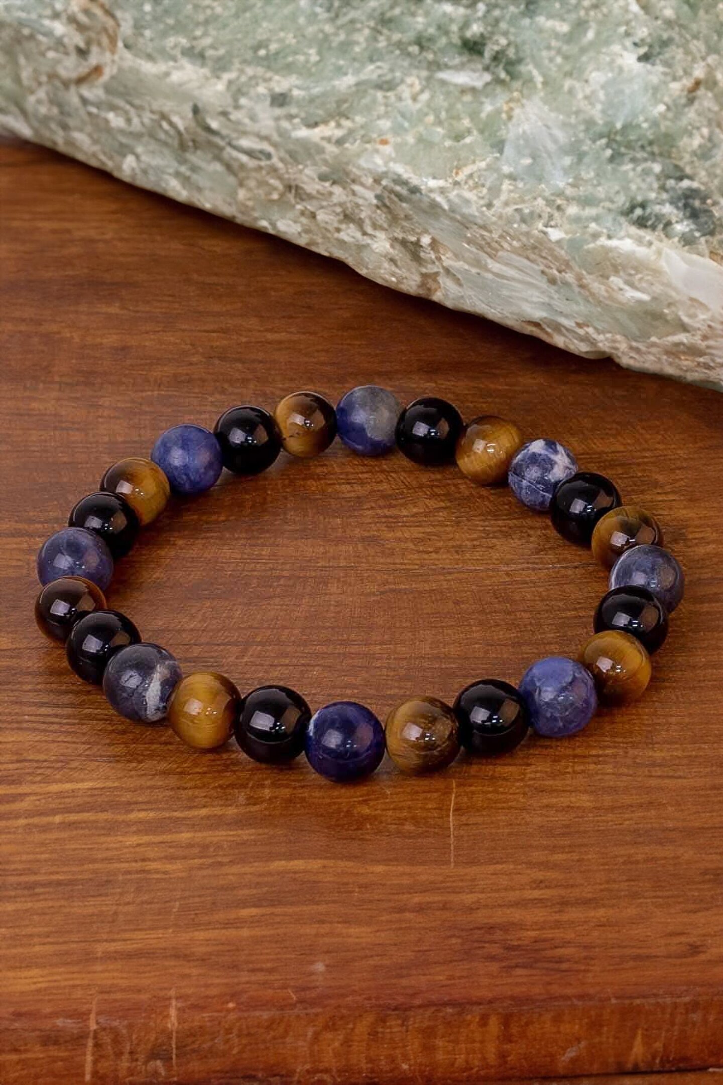 - Doğal taş kullanımı sayesinde her bileklik benzersiz ve otantik bir görünüm sunar; - Kaplan gözü, sodalit ve oniks taşı kombinasyonu ile göz alıcı bir estetik sergiler; - Doğal taş materyali, bilekliğin hem şık hem de dayanıklı olmasını sağlar;