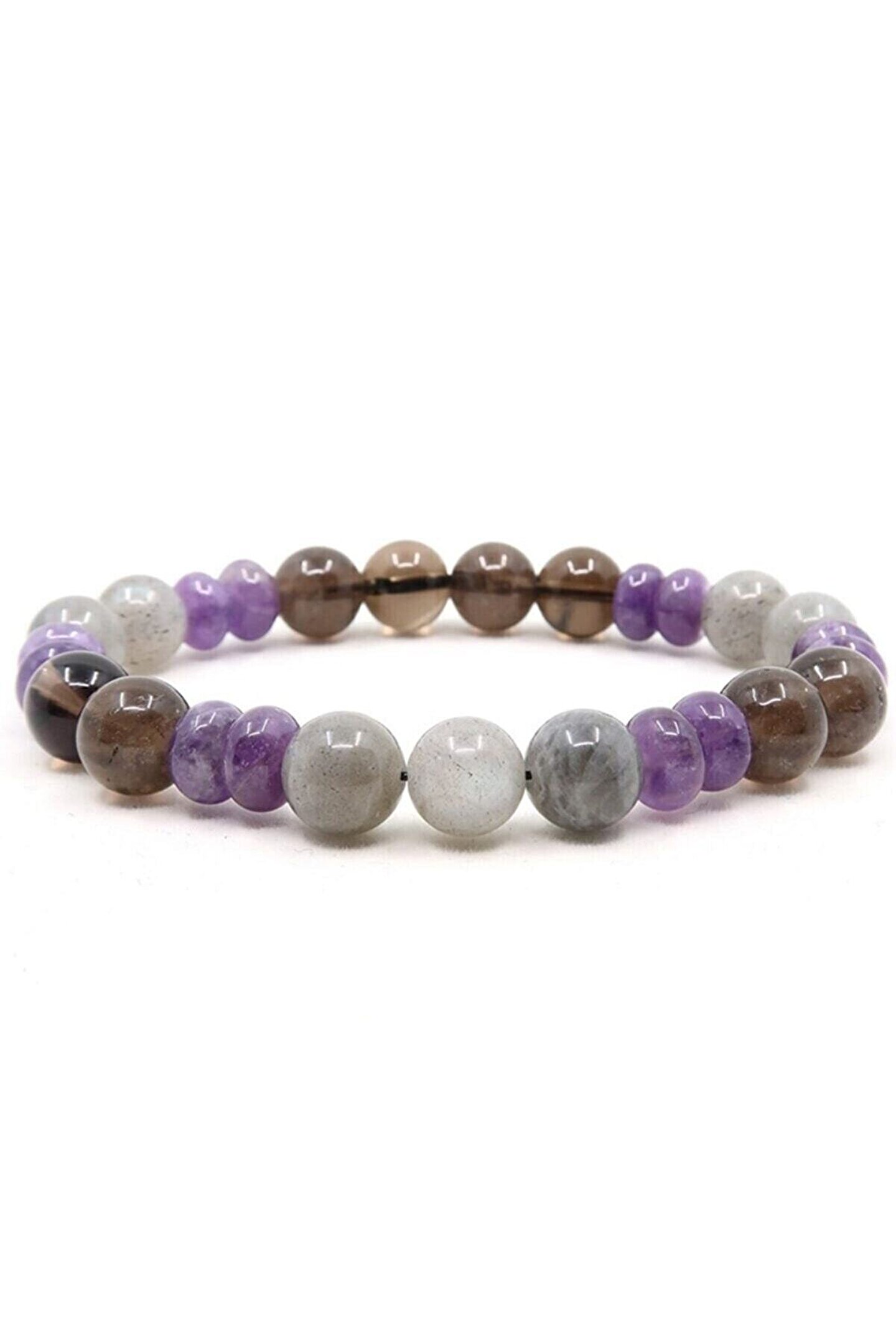 - Doğal taş kullanımı sayesinde her bileklik benzersiz ve otantik bir görünüm sunar; - Ametist, labradorit ve dumanlı kuvars gibi değerli taşların birleşimiyle zenginleştirilmiş tasarım, şıklığı ve doğallığı bir arada sunar; - 8 mm kalınlığındaki bileklik, rahat bir kullanım sağlarken bileğinizin doğal hatlarını zarifçe sarar; - Doğal taş materyali ile hem estetik hem de sağlığa faydaları bir arada sunan bu bileklik, günlük kullanım için idealdir;
