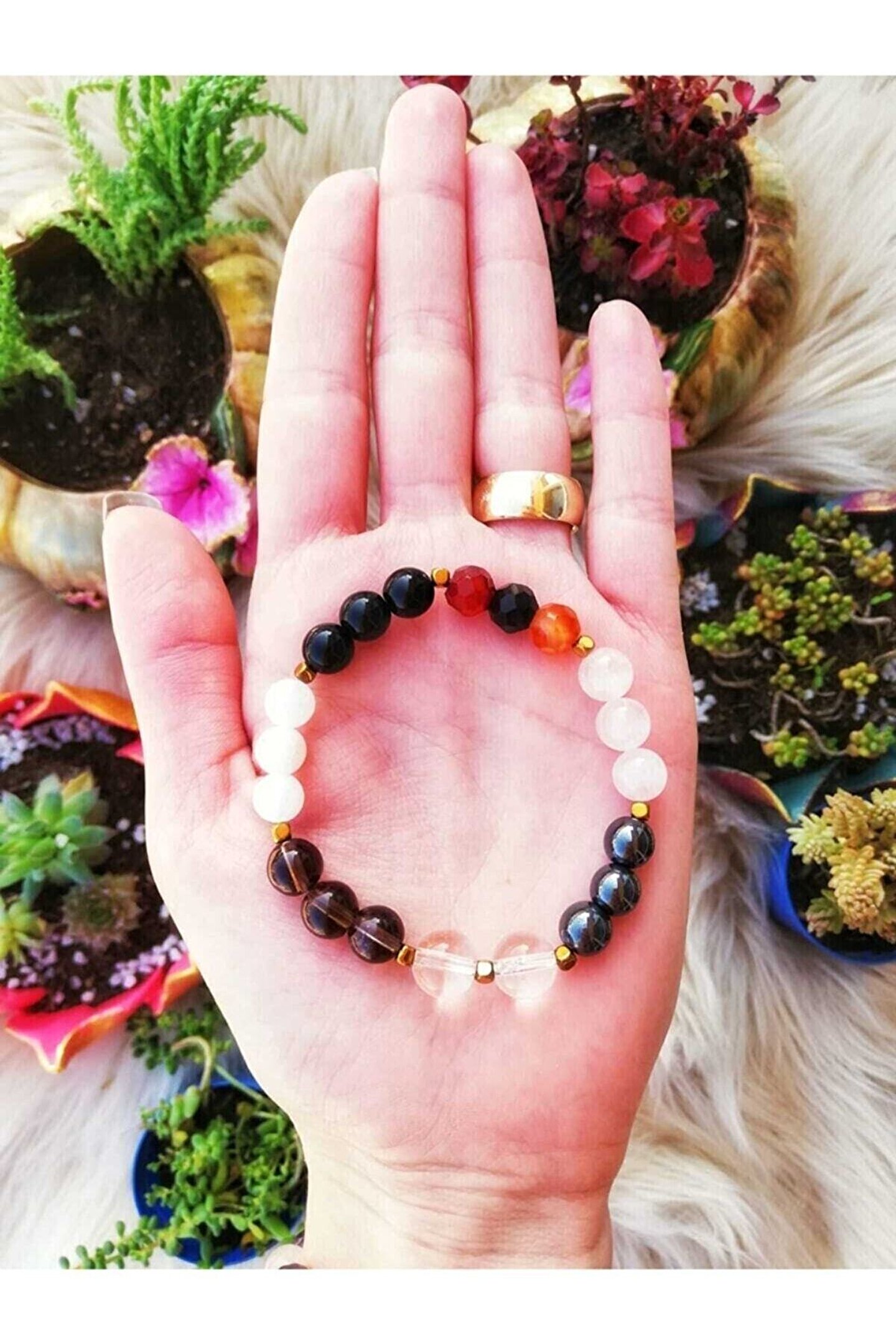 Ürünümüz orijinal doğal taşlardan hazırlanmıştır.; ; Unisex modeldir.; ; Bileklik aslan burcunun en önemli 7 taşından oluşmaktadır.; ; Bunlar kristal kuvars, pembe kuvars, akik, hematit, dumanlı kuvars, oniks, aytaşı taşlarıdır.; Taşların boyutu 8mm.; ; Ara aparatları nikel kaplamadır.; ; Elastik misina kullanılmıştır.; ; Hediye kutusunda gönderilmektedir.; ; Taşlarınızı haftada bir kez akan suda 5dk bekleterek, tütsüleyerek veya bir gece toprak üstünde bekleterek enerjilerini dengeleyip temizleyebilirsiniz.; ;