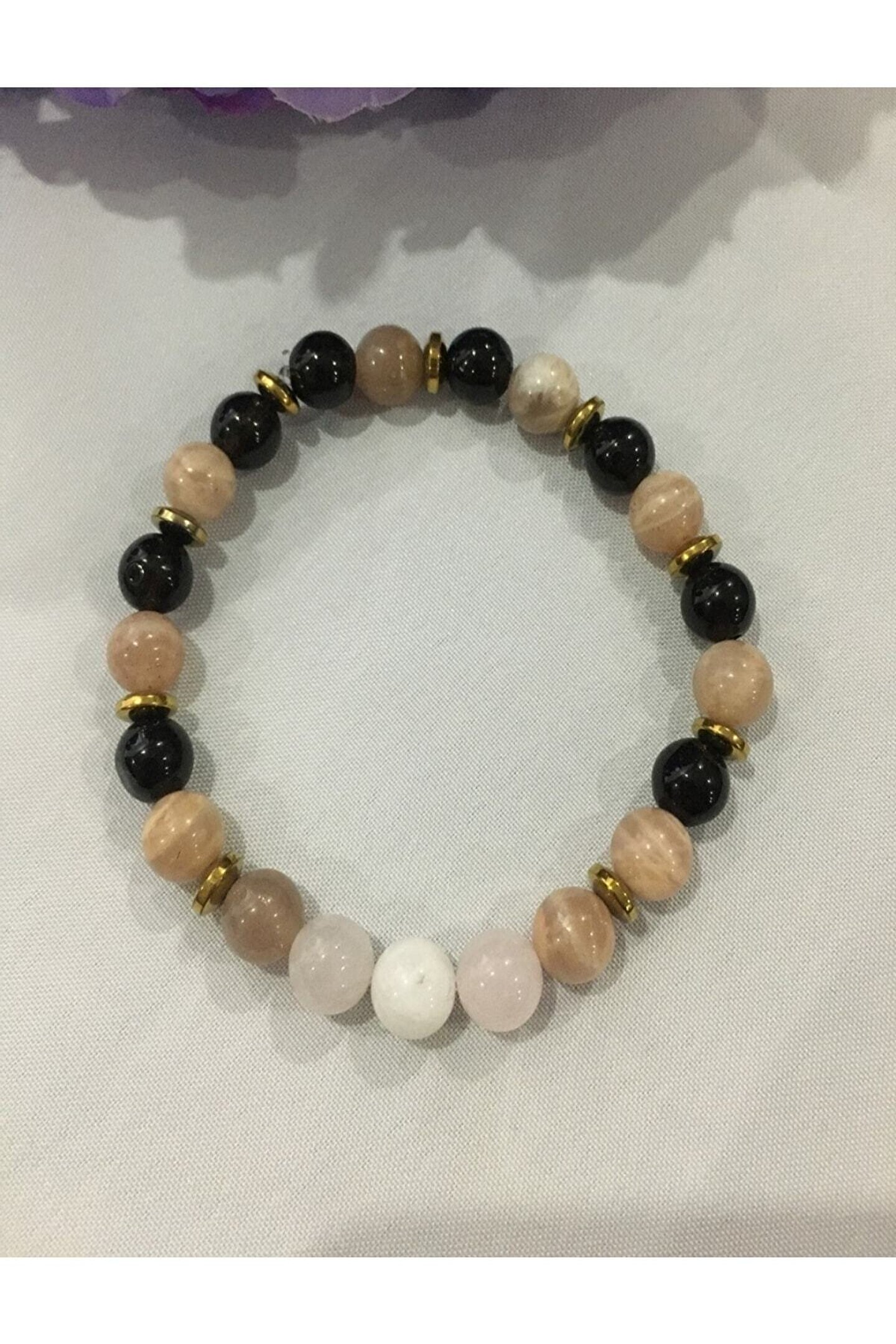 Doğal taş bileklik, şıklığı ve doğallığı bir arada sunar; Panik atakları önlemeye yardımcı olan güneş taşı, stres ve kaygıyı azaltır; Dumanlı kuvars, negatif enerjiyi nötralize ederek zihinsel dengeyi sağlar; Ay taşı, duygusal dengeyi destekler ve ruhsal huzur verir; Pembe kuvars, sevgi ve şefkat enerjisini artırarak pozitif bir etki yaratır;