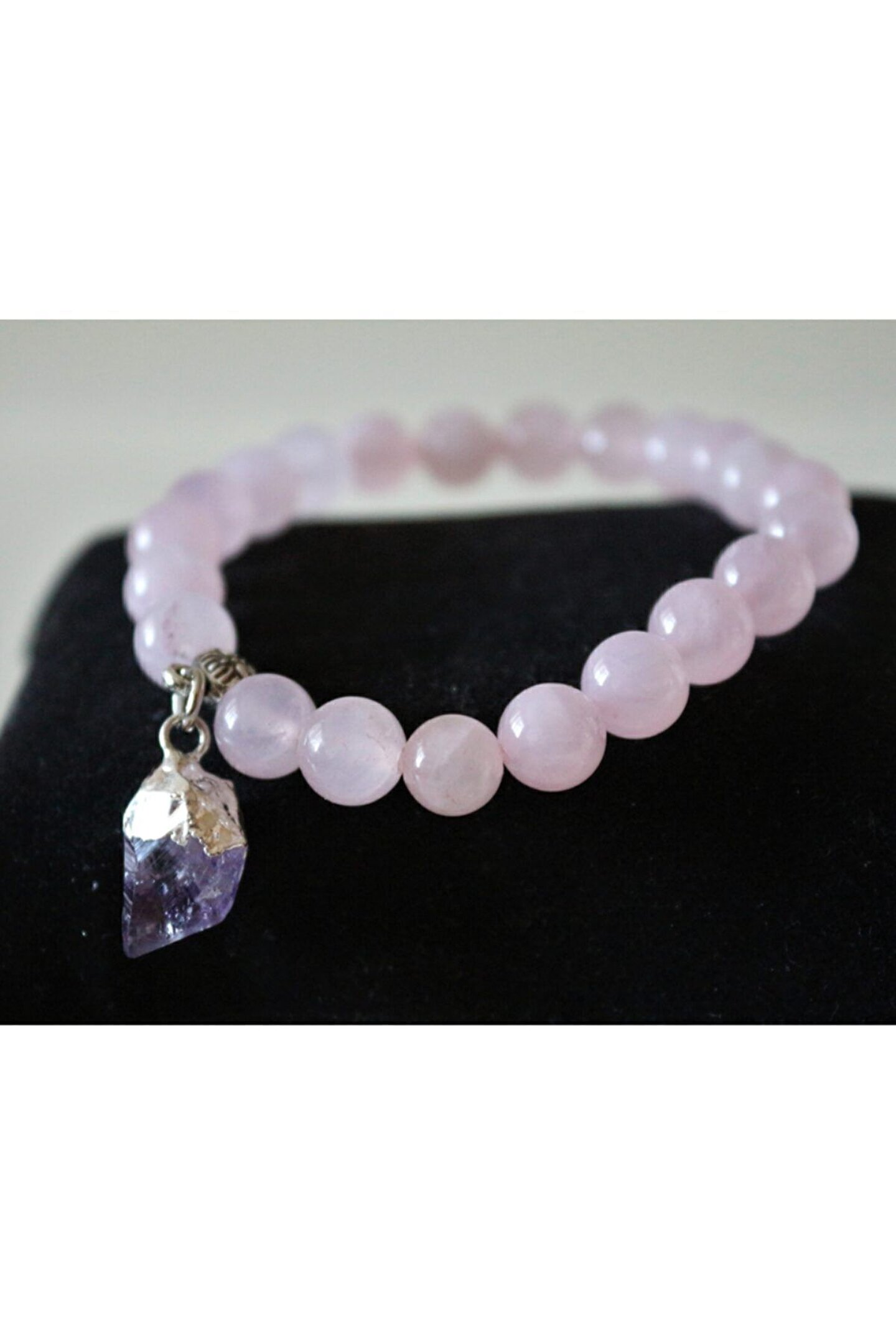 Pembe kuvars taşı, kalbi hastalık ve travmalara karşı korur.; Mutluluk duygusu verir.; Ametist ile uyumlu kullanıldığı zaman bir şekilde enerjiyi arttırır ve aşk duygusunu güçlendirir.; Burçları; Koç, boğa, ikizler, yengeç, başak, Uyumlu olduğu çakra; Boğaz çakrası ve 4. Kalp çakrası; Elastik yapıda olduğu için yetişkin kadın ve erkekler için uygundur, bu üründe kullanılan işlenmemiş ametist taşı şekli küçük farklılıklar gösterebilir Bu üründe kullanılan doğal taş: Pembe kuvars taşı, ametist taşı Bu üründe kullanılan doğal taş boyutu: Ortalama çap : 8 mm; Ortalama uzunluk : 19 cm ( tek sıra );