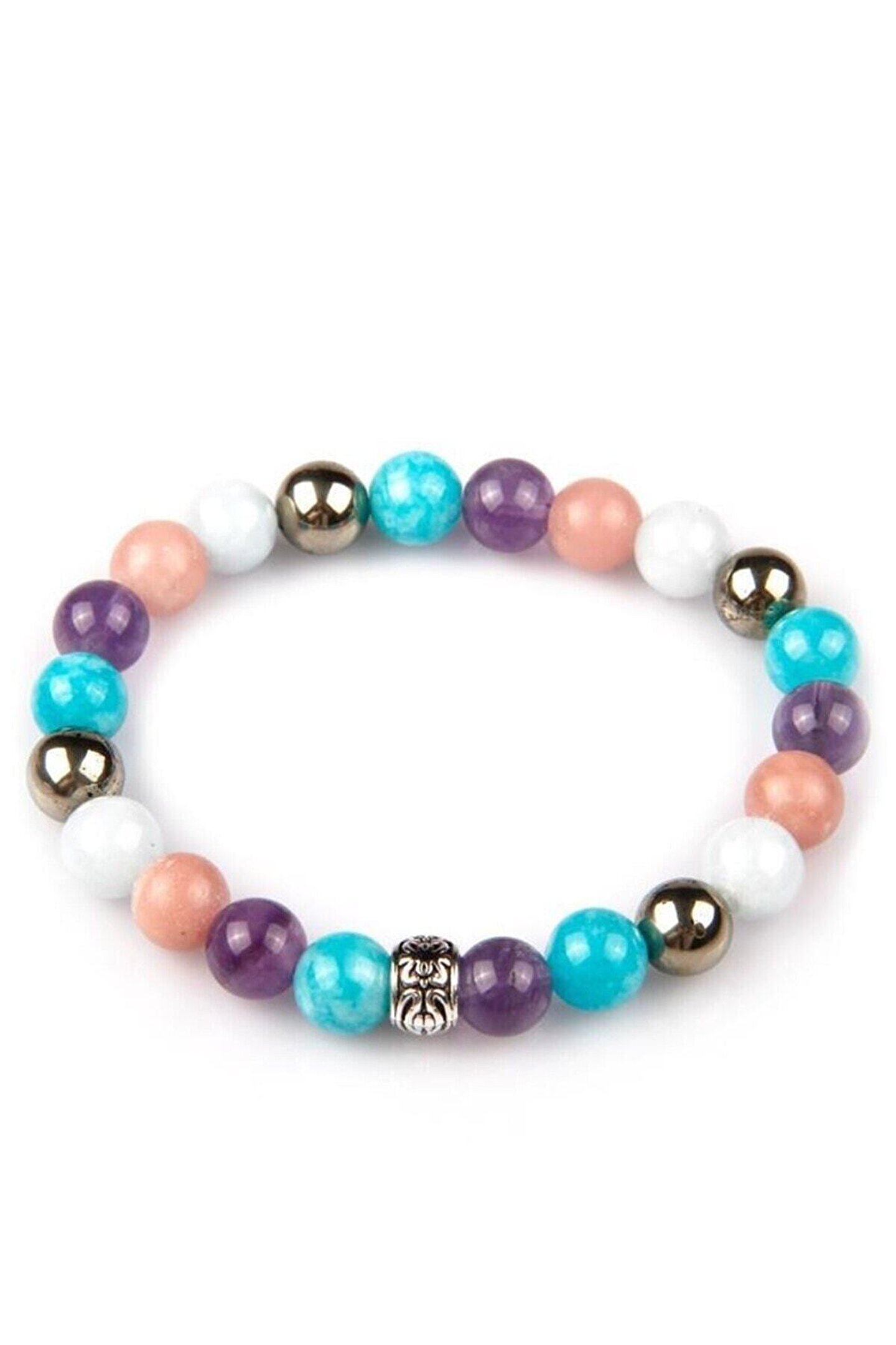 DOĞAL TAŞ CENNETİ Pirit – Ametist – Akuamarin- Amazonit – Mangona Kalsit Doğal Taş Bileklik 8 mm Küre Kesim