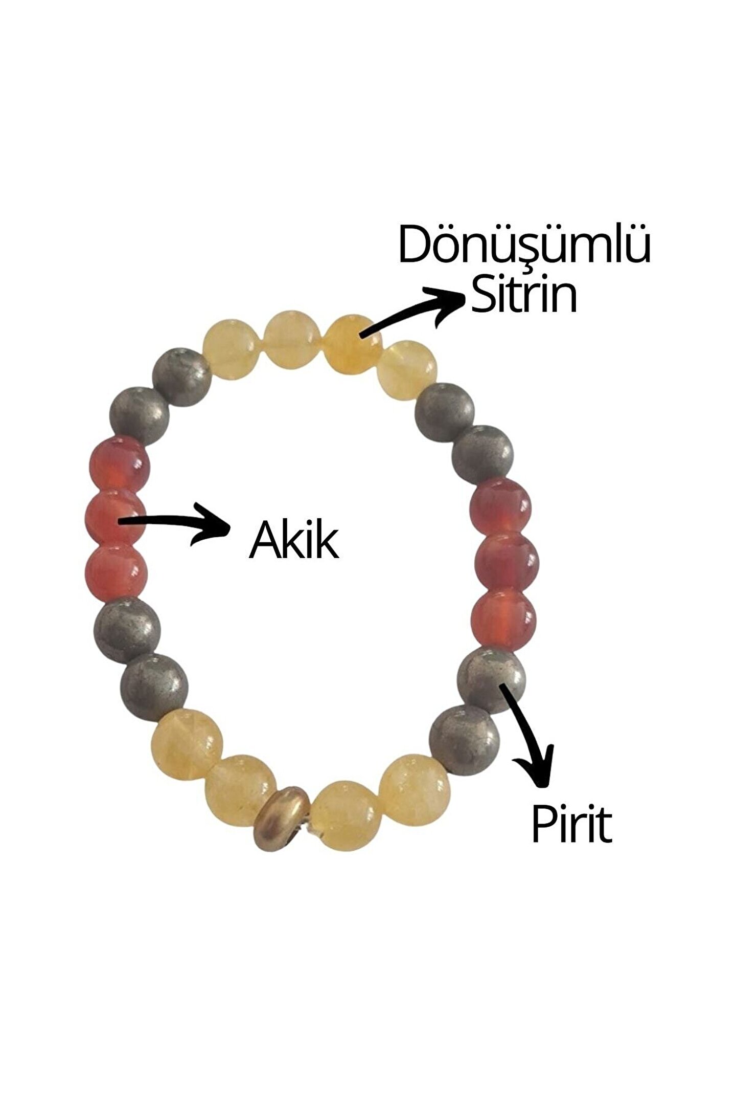 Özel Tasarım Doğal Taş Bileklik Ürünlerimiz gerçek doğal taştır.; ; Sertifikasıyla birlikte gönderilir.; ; Bileklikte Kullanılan Taşlar Pirit, Dönüşümlü Sitrin, Akik Pirit Taşı Neden Tercih Ediliyor Pirit Taşı demir taşı olarak da bilinir.; ; Hem erkeklerde hem de kadınlarda koruyucu ve iddialı eril enerjiyi arttırdığı söylenir.; ; Fiziksel ve duygusal tehditlere karşı koruyucu olduğuna inanılır.; ; Doğal liderlik niteliklerini ortaya çıkardığı söylenir.; ; Özgünlüğü artırdığına inanılır.; ; Kaybolan tutkuları canlandırmak amacıyla kullanılır Sitrin Taşı Neden Tercih Ediliyor Metabolizmayı hızlandırdığı söylenir.; ; Kilo kaybına yardımcı olmak için kullanılır.; ; Başarı Taşıdır.; ; Kendine güvenme duygusunu güçlendirdiği söylenir.; ; Negatif enerjiyi dağıttığı söylenir.; ; Zenginliği ifade eder.; ; Maddi geliri arttırdığına inanlar vardır.; ; Kendisini taşıyan kişiye neşe ve mutluluk duyguları verdiğine inanılır.; ; Akik Taşı Neden Tercih Ediliyor Genel sağlık taşı olarak bilinir.; ; Vücuttaki fazla veya negatif enerjiyi boşalttığı ve sakinleştirdiği söylenir.; ; Vücudun kendini yorgun ve bitkin hissettiği zamanlarda toparlamasına yardımcı olduğu söylenir.; ; Kişinin sosyalleşmesine ve çevreye uyum sağlamasına yardımcı olduğuna inanılmaktadır.; ; Korkuları yenmeye, cesareti artırmaya yardımcı olduğu söylenir.; ; Akıl ve mantık gücünü geliştirdiğine inanıldığı için sanatçılar tarafından çokça tercih edilmektedir;