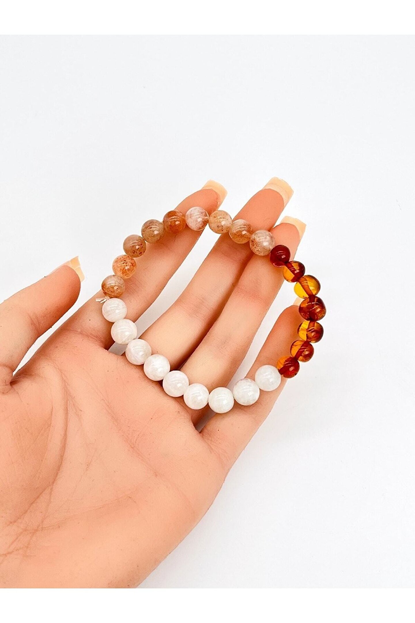 Doğal kehribar ve ay taşı kullanılarak tasarlanmış, her biri benzersiz ve özgün bir görünüm sunar; Güneş taşı ile zenginleştirilmiş bileklik, enerjiyi pozitif yönde kanalize eder ve şıklığıyla dikkat çeker; 8 mm kalınlığındaki bileklik, hem rahat bir kullanım sağlar hem de zarif bir aksesuar olarak öne çıkar; Sertifikalı kehribar ve ay taşı kullanımı, ürünün kalitesini ve orijinalliğini garanti eder;